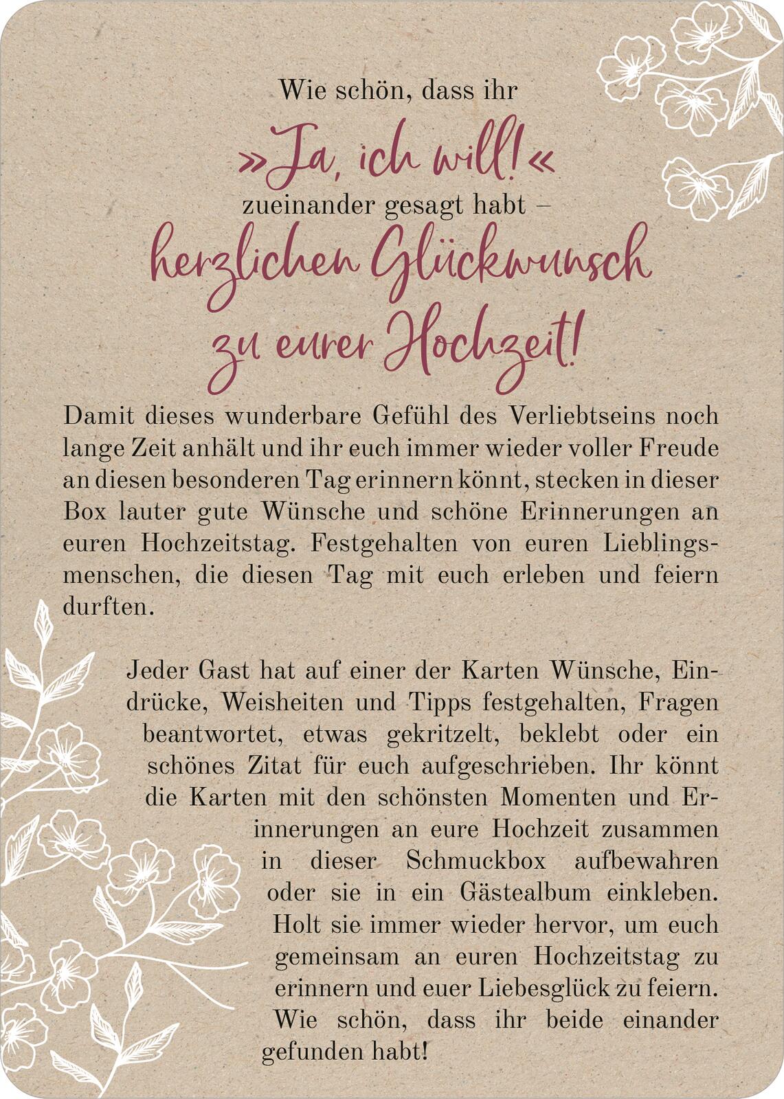 - Das besondere Gästebuch für die Hochzeit: Die Wunschkarten sind leicht auszufüllen und halten die schönsten Momente der Hochzeit fest