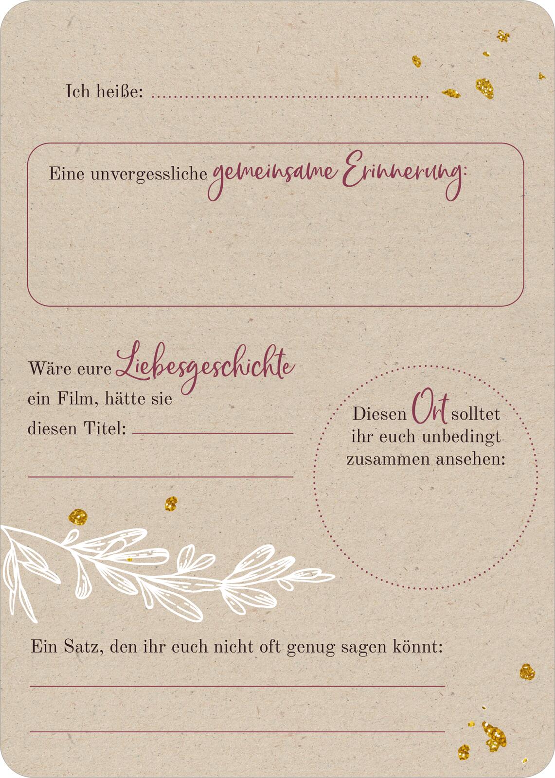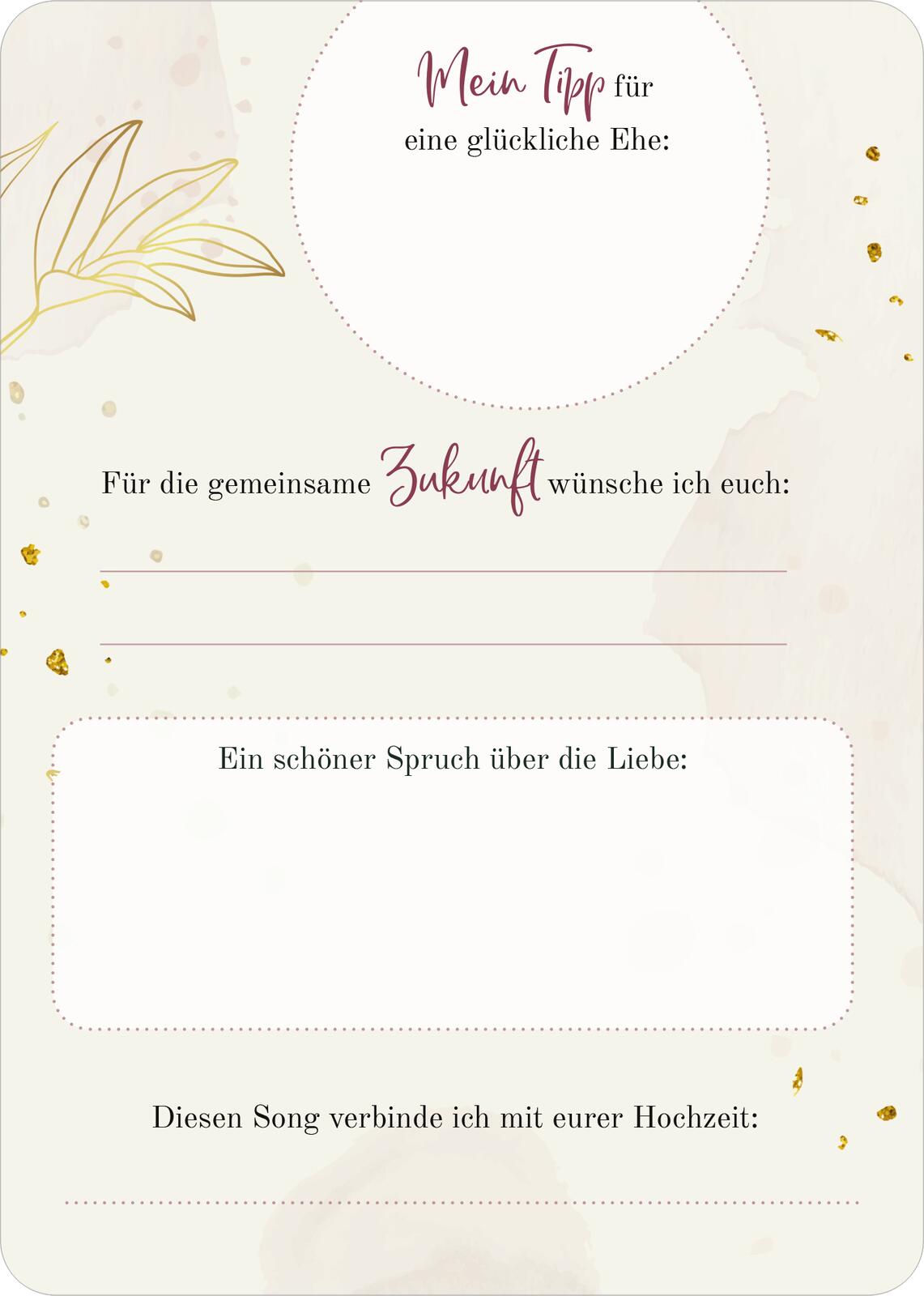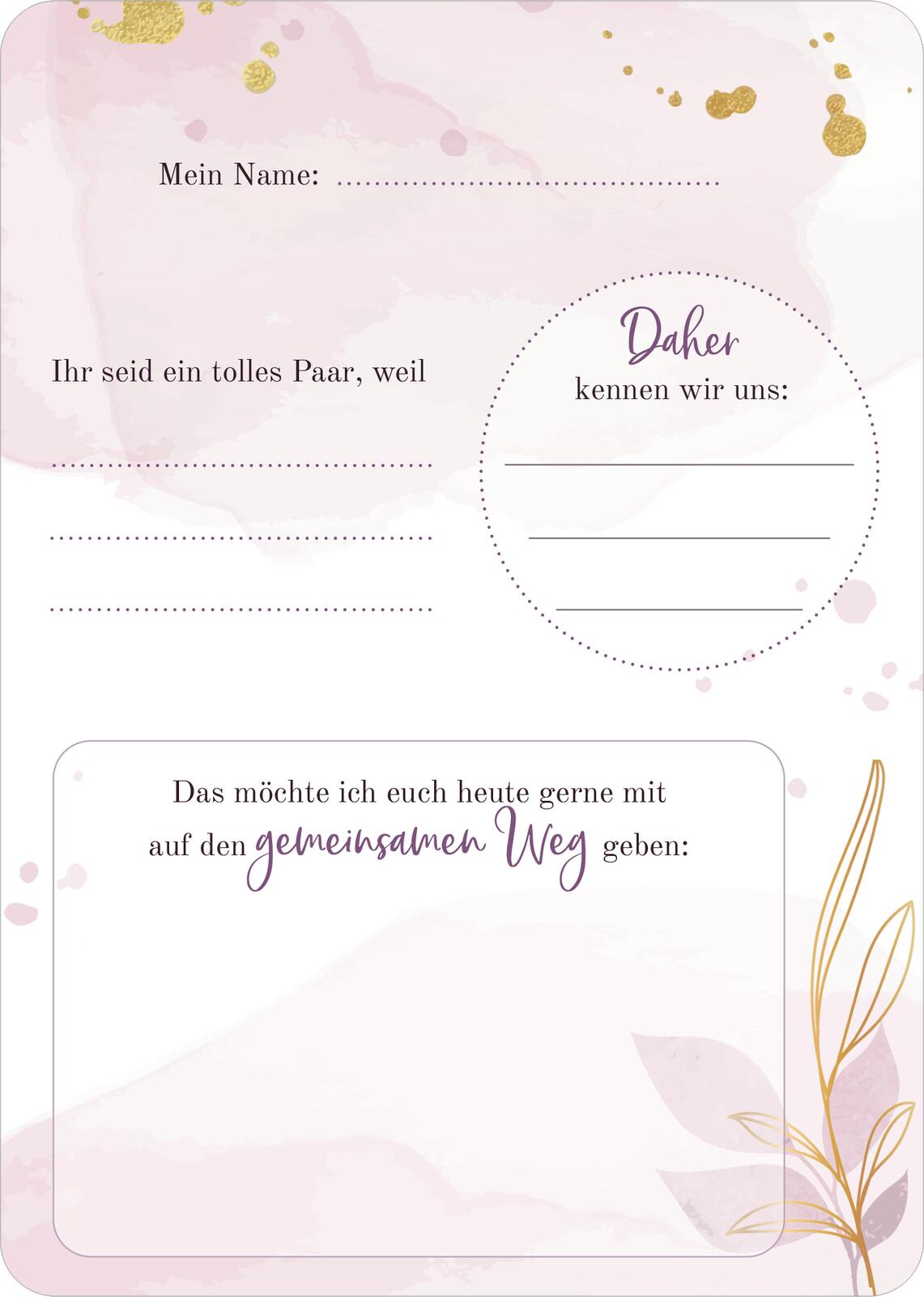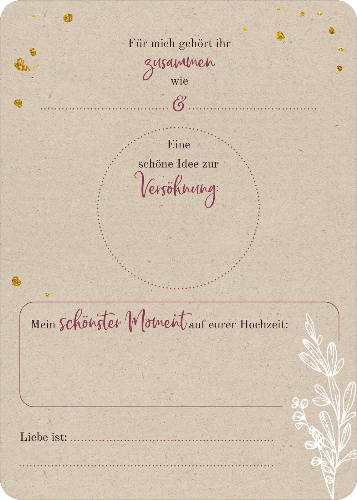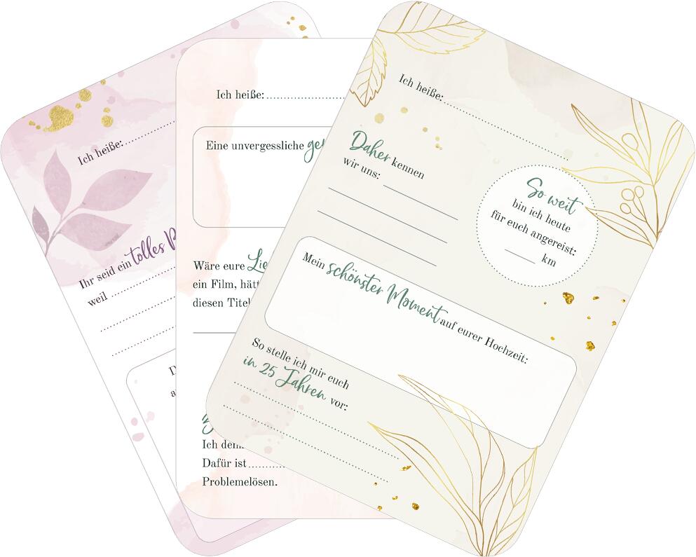 - Tolles Hochzeitsspiel: Diese Gästebuch-Karten sorgen für Spaß beim Ausfüllen! Ob romantisch oder lustig, mit Eintragmöglichkeiten oder Platz für eigene Wünsche – es ist für jeden etwas Passendes dabei