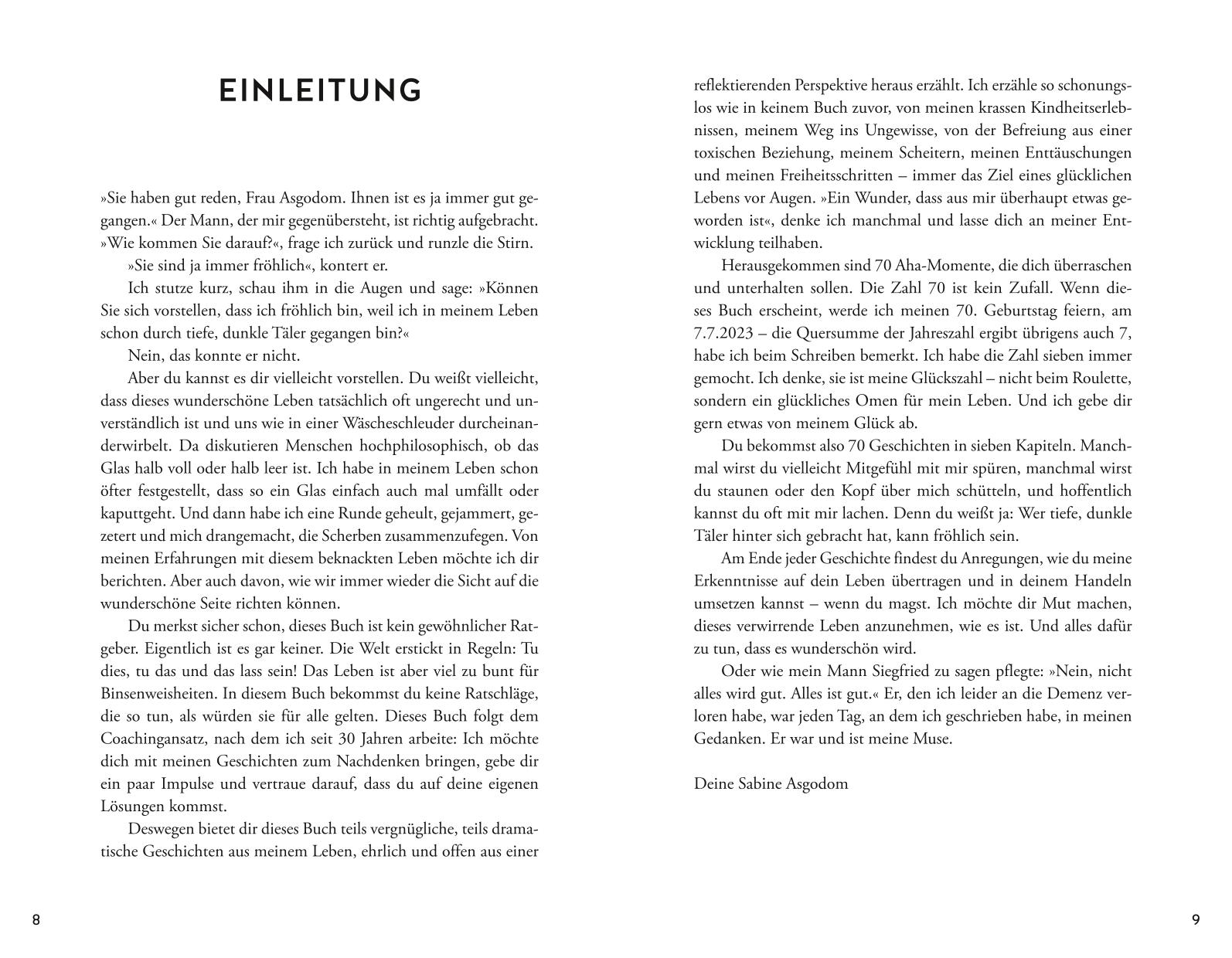 - Beschreibung In diesem Buch lässt Sabine Asgodom uns teilhaben an den wichtigsten Erkenntnissen, die sie im Lauf ihres bewegten Lebens für sich gewonnen hat und die die Kraft haben, auch unseren Blick auf das Leben grundlegend zu ändern. Sie tut dies in 70 teils vergnüglichen, teils dramatischen Geschichten, ehrlich und offen aus einer reflektierten Biographie erzählt. Und zu erzählen hat sie viel: Aus einem unglücklichen niedersächsischen Dorfmädchen wurde eine glückliche Frau, Mutter, Großmutter. Sie erzählt von einschneidenden Kindheitserlebnissen, ihrem Weg ins Ungewisse, von der Befreiung aus einer toxischen Beziehung, ihrem Scheitern, ihren Enttäuschungen und ihren Schritten in die Freiheit, die sie bei all dem immer gesucht hat.