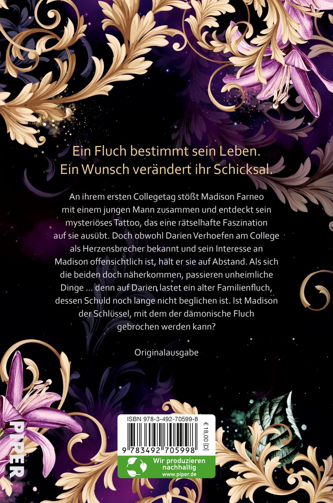 - Beschreibung An ihrem ersten Collegetag stößt Madison Farneo mit einem jungen Mann zusammen und entdeckt sein mysteriöses Tattoo, um das sich Gerüchte ranken. Und Darien Verhoefen gibt noch ganz andere Rätsel auf: Obwohl er am College als Herzensbrecher bekannt und sein Interesse an Madison offensichtlich ist, hält er sie auf Abstand. Als sich die beiden doch näherkommen, passieren unheimliche Dinge … denn auf Darien lastet ein alter Familienfluch, dessen Schuld noch lange nicht beglichen ist. Ist Madisons Liebe der Schlüssel, mit dem der dämonische Fluch gebrochen werden kann?