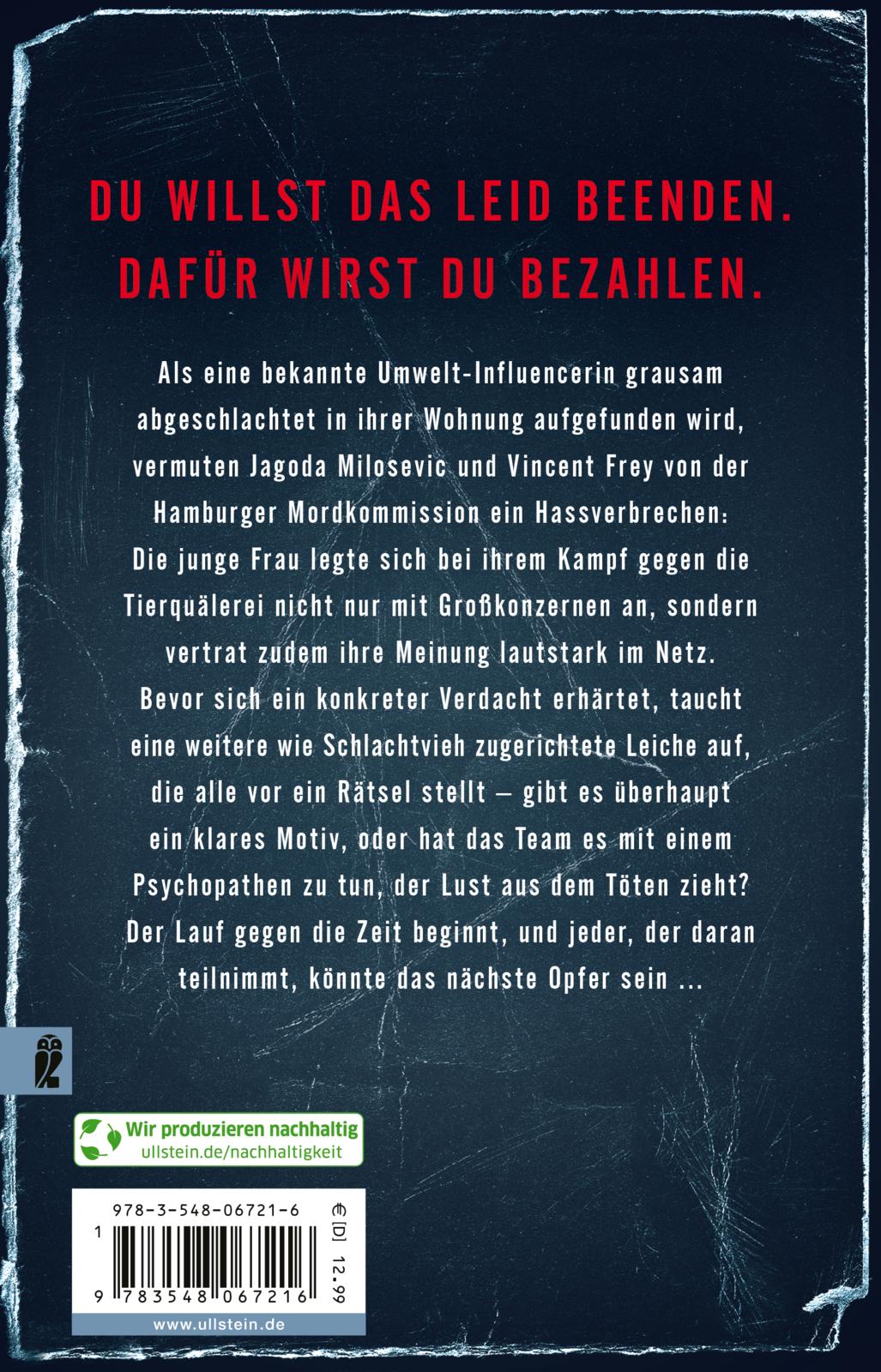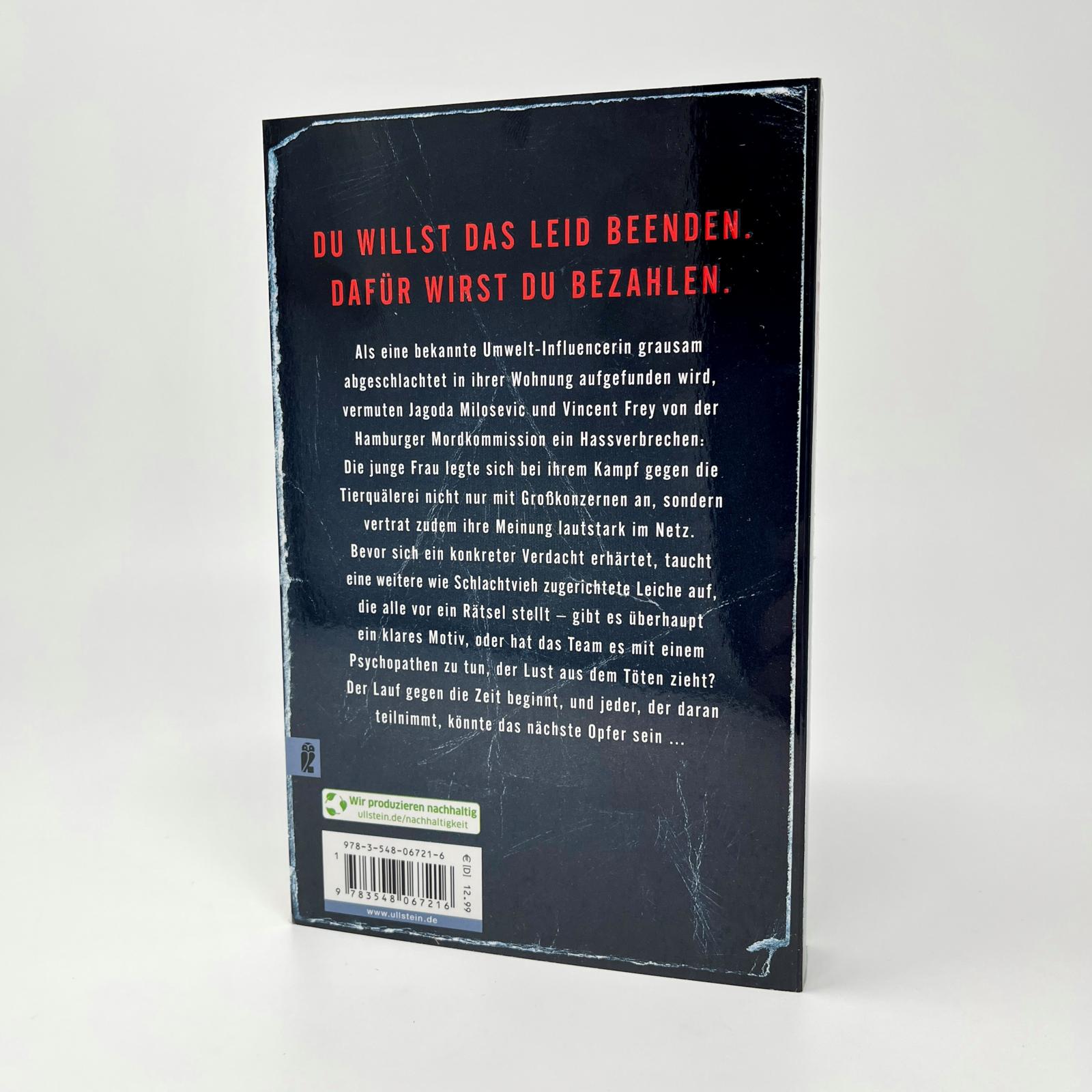 - Beschreibung Sie tut alles, um Tiere zu schützen. Doch sich selbst retten kann sie nicht ...Eine bekannte Umwelt-Influencerin wird auf grausamste Art ermordet in ihrem Loft aufgefunden. Die Mordermittler Jagoda Milosevic und Vincent Frey gehen zunächst von einem Hassverbrechen aus. Die junge Frau legte sich nicht nur mit Großkonzernen an, auch im Netz vertrat sie lautstark ihre extreme Haltung und machte sich nicht nur Freunde damit. Doch je länger Milo und Vince im Umfeld der Toten ermitteln, desto mehr geraten auch Menschen, die ihr nahestanden, unter Verdacht. Die Tierschützerin hatte sich mehr als einmal mit ihrer Arbeit und ihren illegalen Recherchen in tödliche Gefahr gebracht, und auf ihren Spuren tun dies nun auch Vince und Milo … Milosevic und Frey ermitteln gegen einen übermächtigen GegnerZwischen Menschhandel und der Fleischindustrie ermitteln Vincent Frey und Jagoda Milosevic in diesem düsteren Thriller für alle Fans von "Die Brücke" und "Fake".