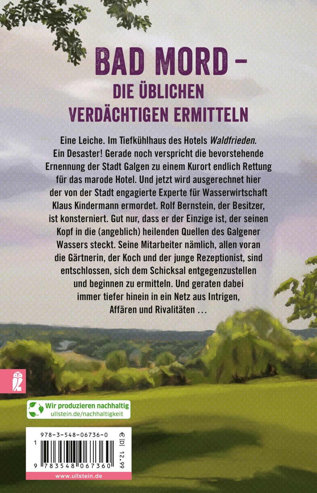Die Stadt Galgen ist viel freundlicher und lauschiger, als ihr Name besagt. Und bald soll sie sogar Kurort werden. Was sehr gut wäre für Rolf Bernstein und sein Hotel Waldfrieden. Denn um das ist‘s finanziell nicht unbedingt gut bestellt, und da wären zahlungskräftige Kurgäste hochwillkommen. Aber das Schicksal hat andere Pläne: eine Leiche. Im Tiefkühlhaus des Hotels. Ein Desaster! Die Existenz des Hotels steht auf dem Spiel – und damit die Jobs von Katja Krassowitz, Paul Hörl und Leon Fußangel, ihres Zeichens Gärtnerin, Koch und Rezeptionist im Waldfrieden. Die drei beginnen zu ermitteln, zuerst gegen- und bald miteinander. Und geraten immer tiefer hinein in ein Netz aus Intrigen, Affären und Rivalitäten …