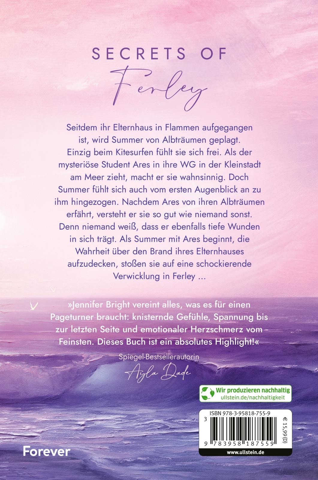 - Beschreibung Secrets of FerleySeitdem ihr Elternhaus in Flammen aufgegangen ist, wird Summer von Albträumen geplagt. Einzig beim Kitesurfen fühlt sie sich frei. Als der mysteriöse Student Ares in ihre WG in der Kleinstadt am Meer zieht, macht er sie wahnsinnig. Doch auch vom ersten Augenblick an fühlt Summer sich zu ihm hingezogen. Als Ares von ihren Albträumen erfährt, versteht er sie so gut wie niemand sonst. Denn niemand weiß, dass er ebenfalls tiefe Wunden in sich trägt. Als Summer mit Ares beginnt die Wahrheit über den Brand ihres Elternhauses aufzudecken, stoßen sie auf eine schockierende Verwicklung …»Jennifer Bright vereint alles, was es für einen Pageturner braucht: Knisternde Gefühle, Spannung bis zur letzten Seite und emotionaler Herzschmerz vom Feinsten. Dieses Buch ist ein absolutes Highlight!« Ayla Dade