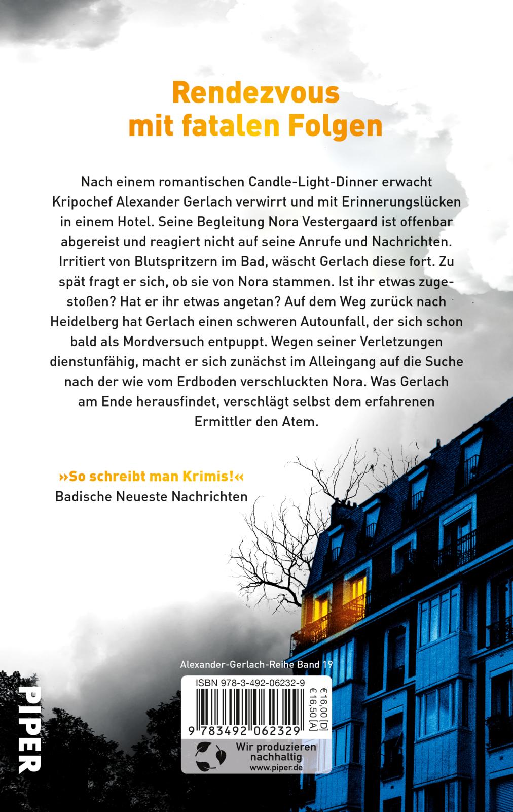 - Beschreibung Nach einem Date erwacht Kripochef Gerlach verwirrt und mit Erinnerungslücken im Hotel. Seine Begleitung Nora Vestergaard ist offenbar abgereist und reagiert nicht auf seine Anrufe. Irritiert von Blutspuren im Bad, wäscht Gerlach diese fort. Zu spät fragt er sich, ob sie von Nora stammen. Ist ihr etwas zugestoßen? Kurz darauf hat Gerlach einen schweren Autounfall, der sich schon bald als Mordversuch entpuppt. Wegen seiner Verletzungen dienstunfähig, macht er sich im Alleingang auf die Suche nach der verschwundenen Nora. Was er herausfindet, verschlägt selbst dem erfahrenen Ermittler den Atem.