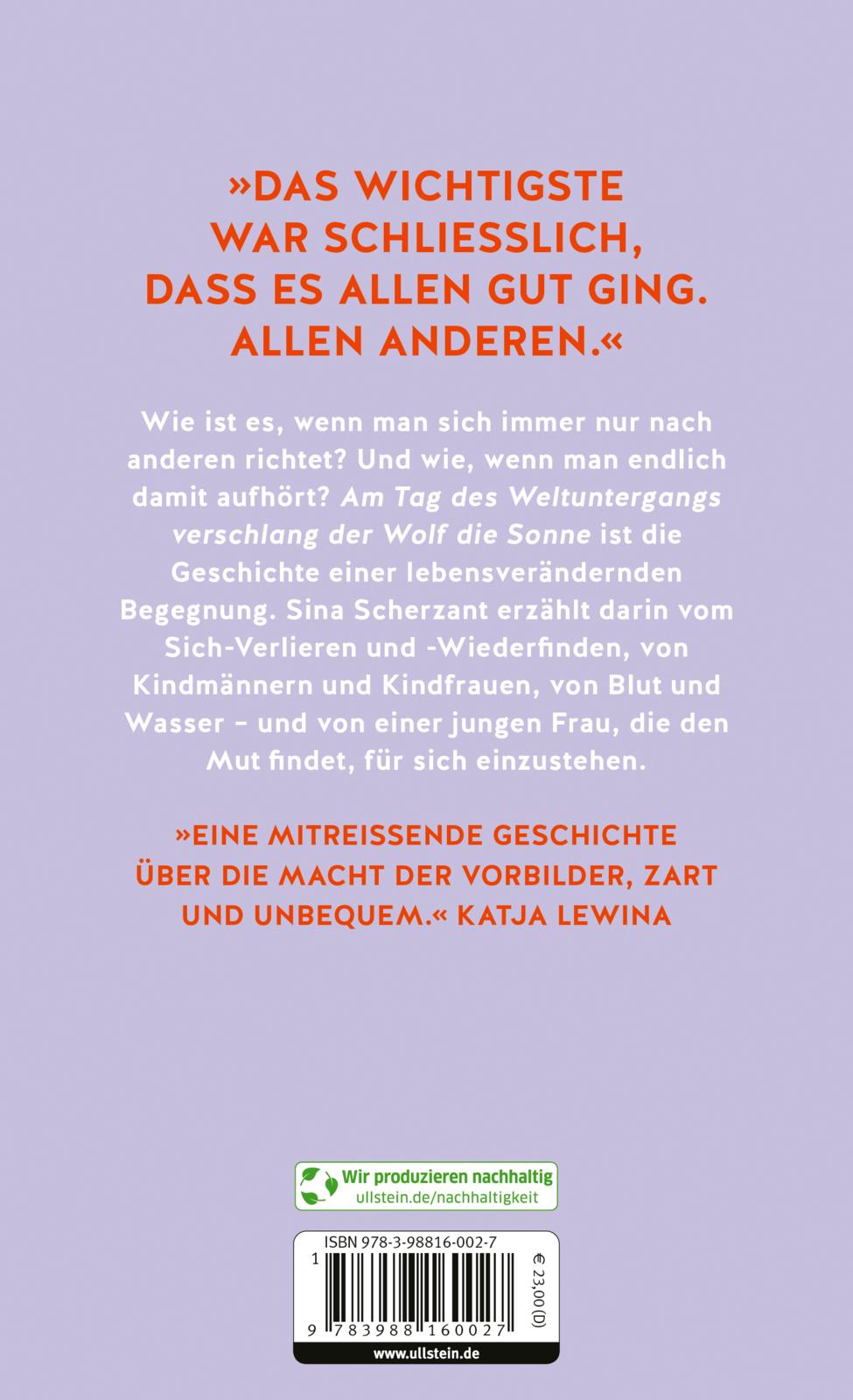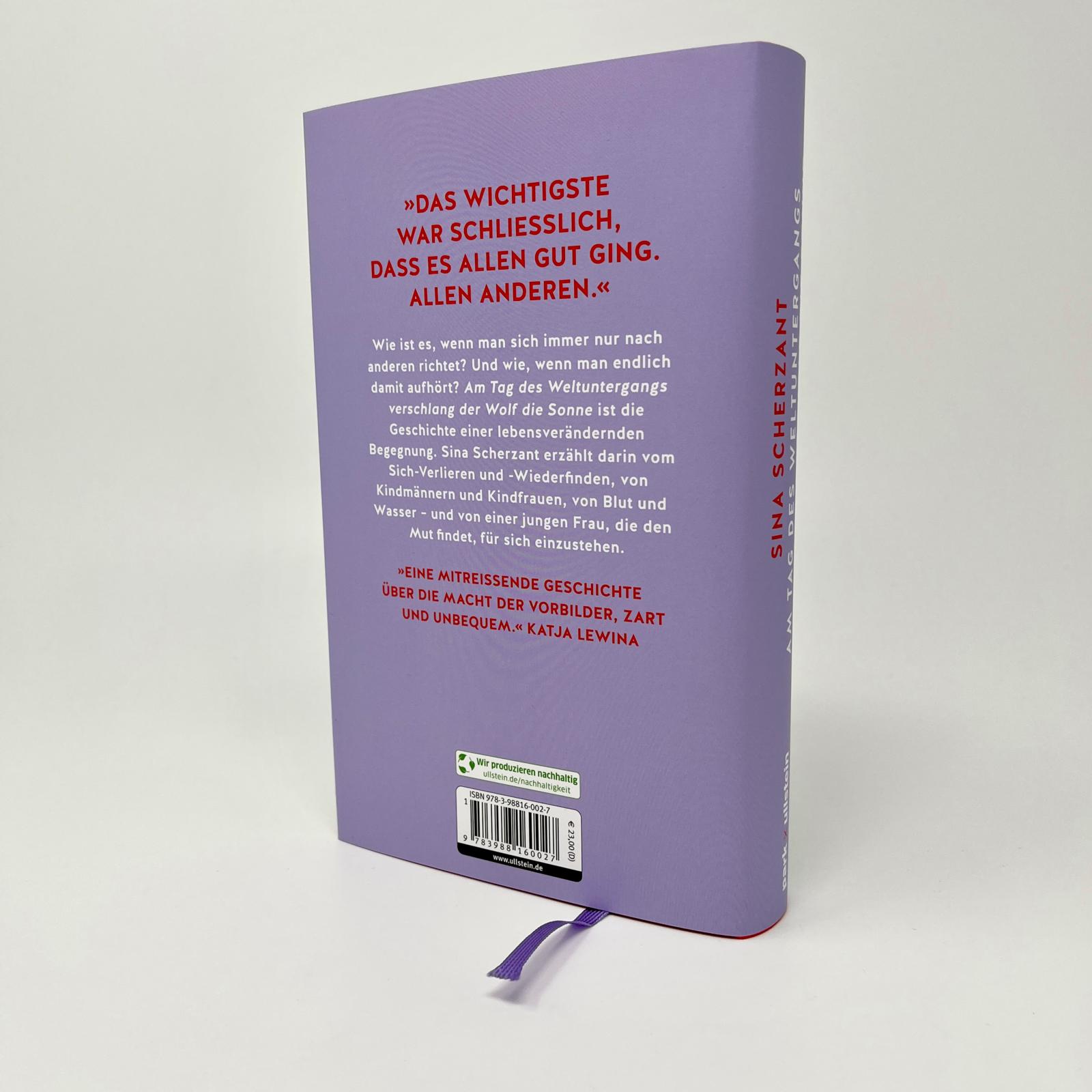 Dies ist die Geschichte einer jungen Frau, in der sich so viele wiedererkennen werden, die glauben, sich den Menschen um sich herum sowie dem Rest des Lebens anpassen zu müssen. „Am Tag des Weltuntergangs verschlang der Wolf die Sonne“ handelt von Freundschaft und Verbundenheit, von Schmerz und Verlust, davon, wie bedeutsam eine Begegnung, wie wichtig ein anderer Mensch für unser Leben, wie lebensverändernd er sein kann. Sina Scherzant erzählt davon zeitgemäß, reflektiert, intensiv und mit großer sprachlicher Kraft.