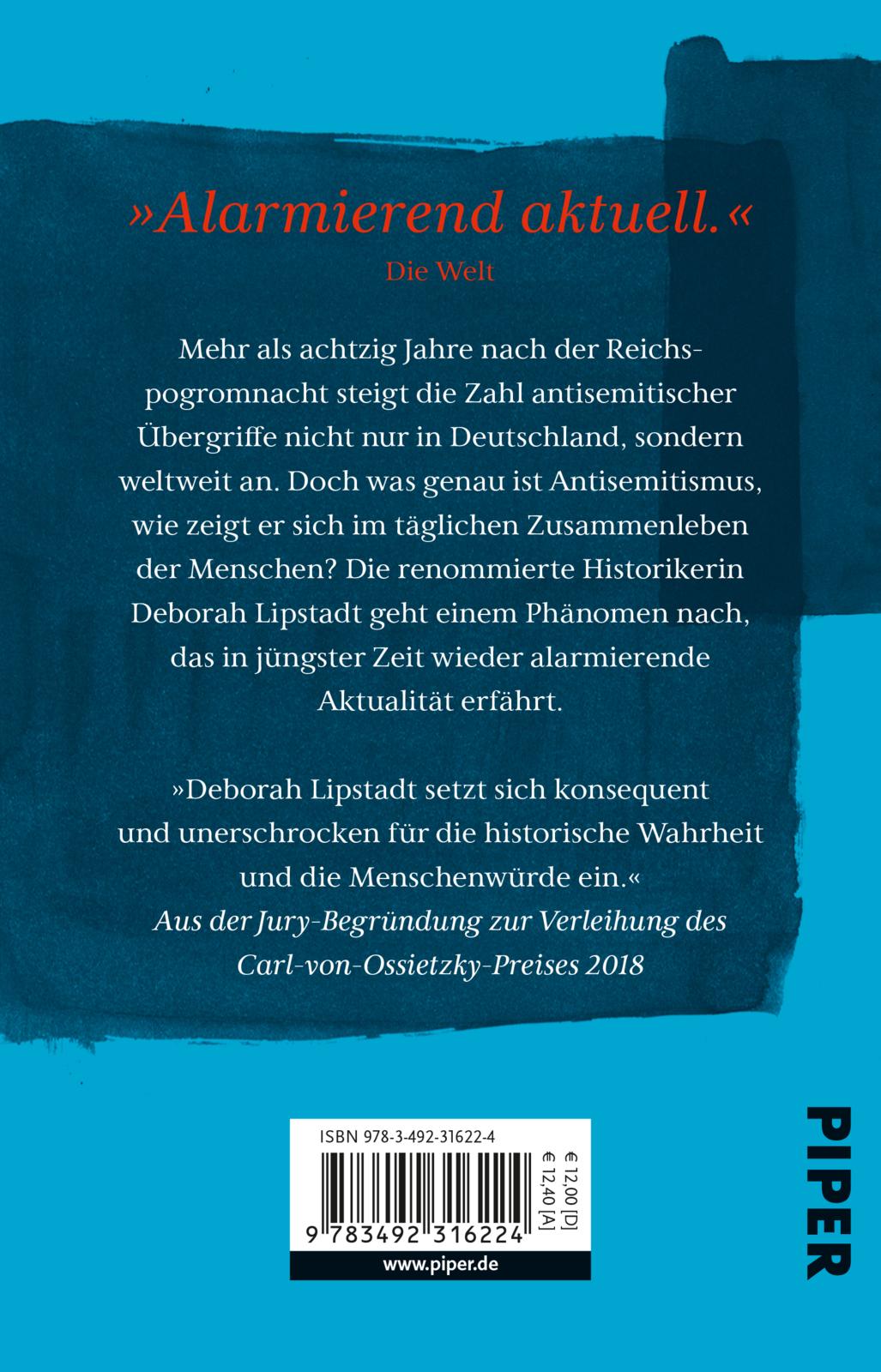 Achtzig Jahre nach der Reichspogromnacht steigt die Zahl antisemitischer Übergriffe nicht nur in Deutschland, sondern weltweit an. Doch was genau ist Antisemitismus, wie zeigt er sich im täglichen Zusammenleben der Menschen? Die renommierte Historikerin Deborah Lipstadt geht einem Phänomen nach, das in jüngster Zeit wieder alarmierende Aktualität erfährt.