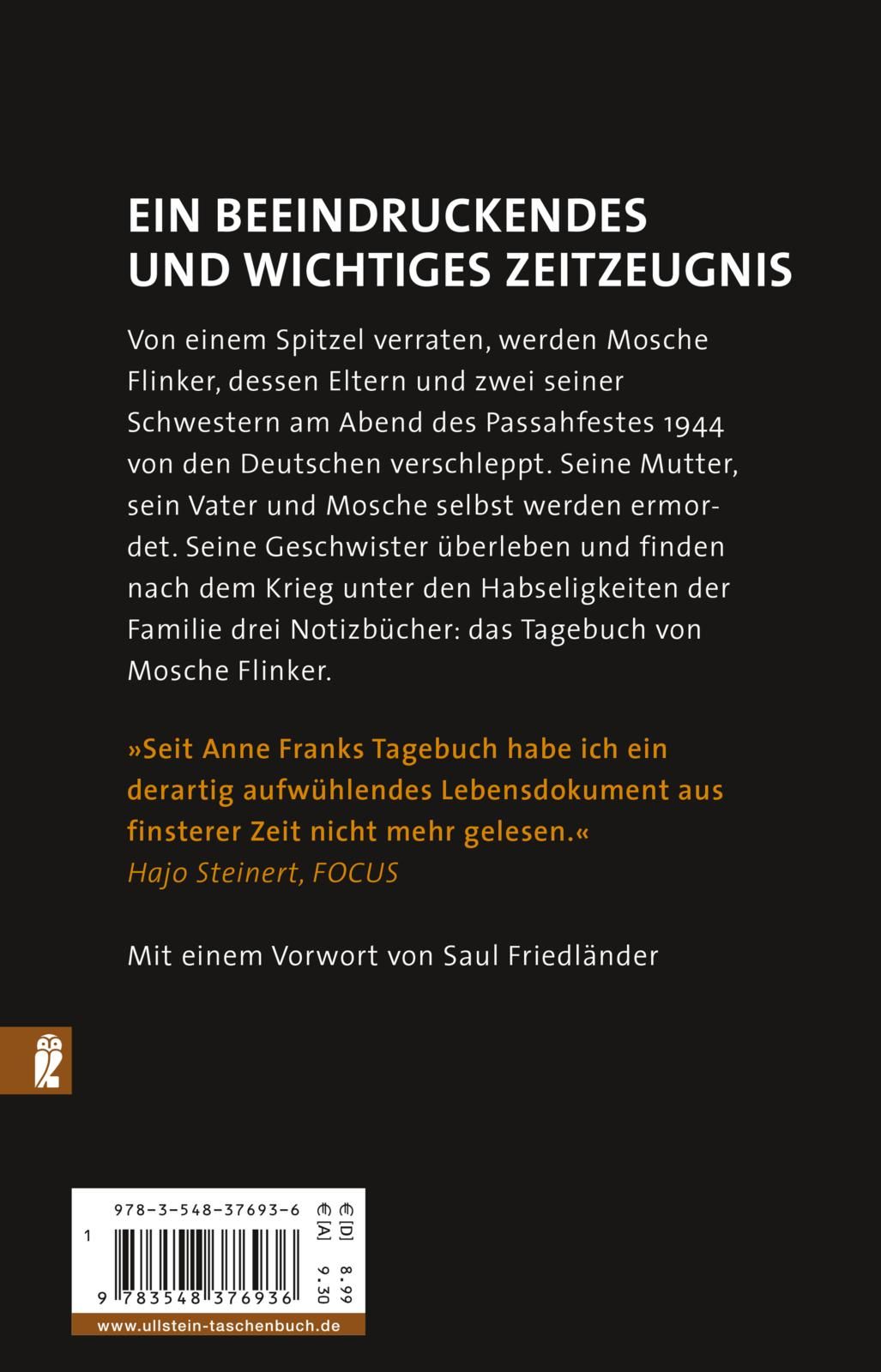 Am Abend des Passahfestes 1944 verhaften die Deutschen Mosche und seine Familie. Der junge Tagebuchschreiber und seine Eltern kommen in Auschwitz um. Seine Geschwister überleben, und unter den Habseligkeiten der Familie, die sich nach dem Krieg wieder finden, entdecken sie drei Notizbücher: das Tagebuch von Mosche Flinker.