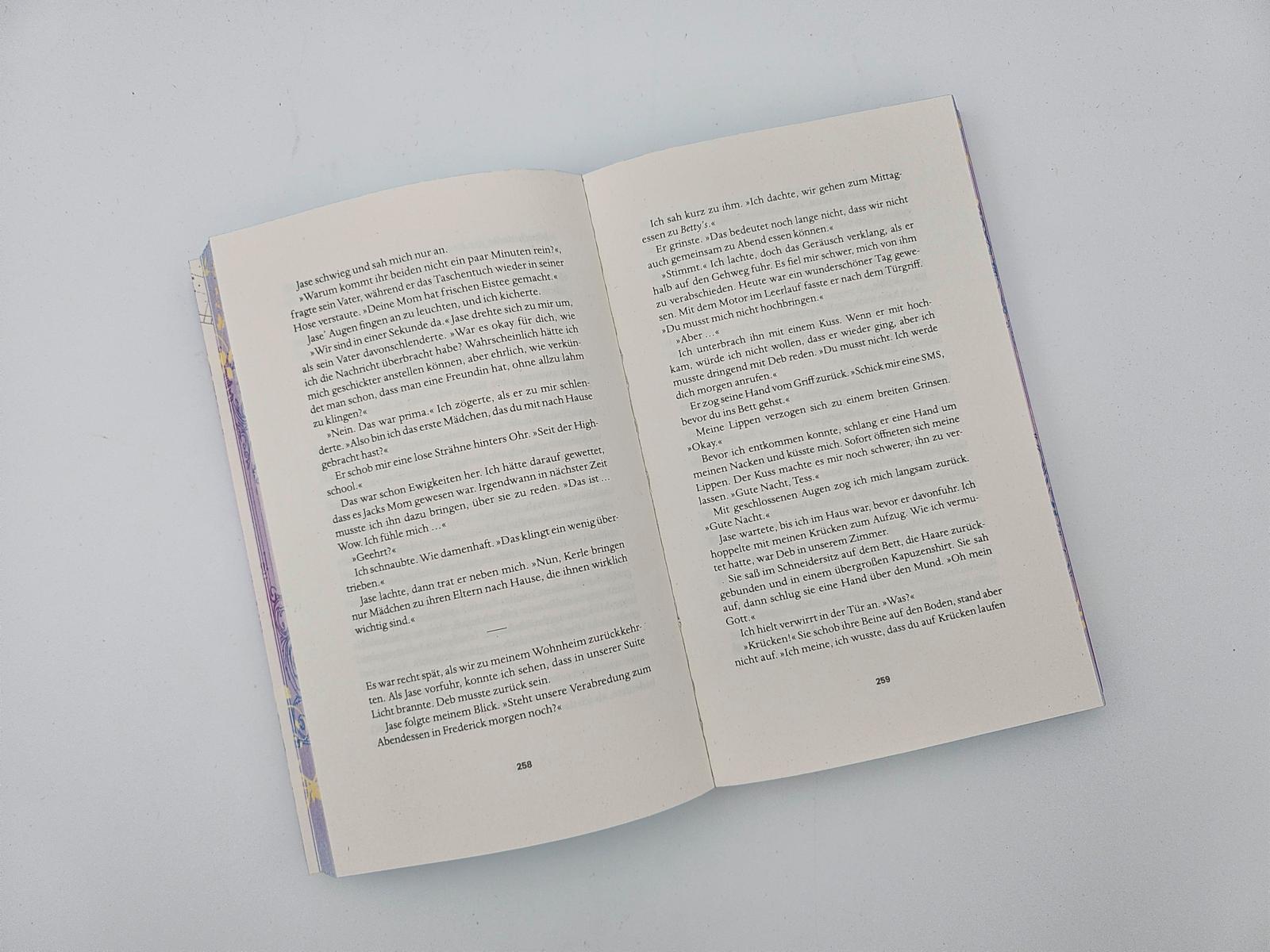 - Beschreibung Teresa Hamilton wollte immer nur eines: Tänzerin werden. Doch als ihr großer Traum nach einer Verletzung plötzlich in weite Ferne rückt, ist es Zeit für Plan B: einen College-Abschluss. An der West Virginia University trifft sie dann nicht nur ihren Bruder Cameron, sondern auch dessen besten Freund Jase Winstead – der Teresa einst den unglaublichsten Kuss gab, den die Welt je gesehen hat. Danach hat er allerdings kein Wort mehr mit ihr gesprochen, und auch jetzt will er ganz offensichtlich nichts mit ihr zu tun haben ...Hinweis: Farbschnitt nur in limitierter Auflage vorrätig. Sobald alle Exemplare mit Farbschnitt ausverkauft sind, liefern wir das Buch ohne Farbschnitt aus.