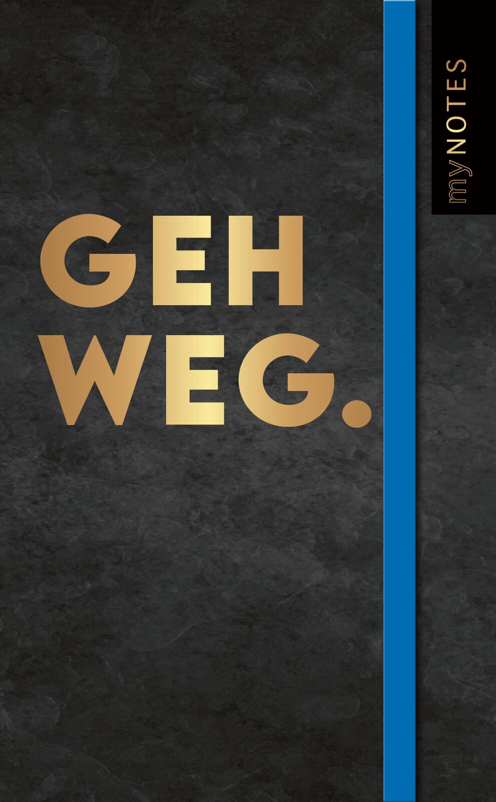 - Schnörkelloses Design, auf den Punkt gebracht: Auf schwarzem Hintergrund schimmert in großen goldenen Buchstaben kurz und prägnant der Satz: „Geh weg.“ Das blaue Gummiband setzt dabei noch einen Farbakzent