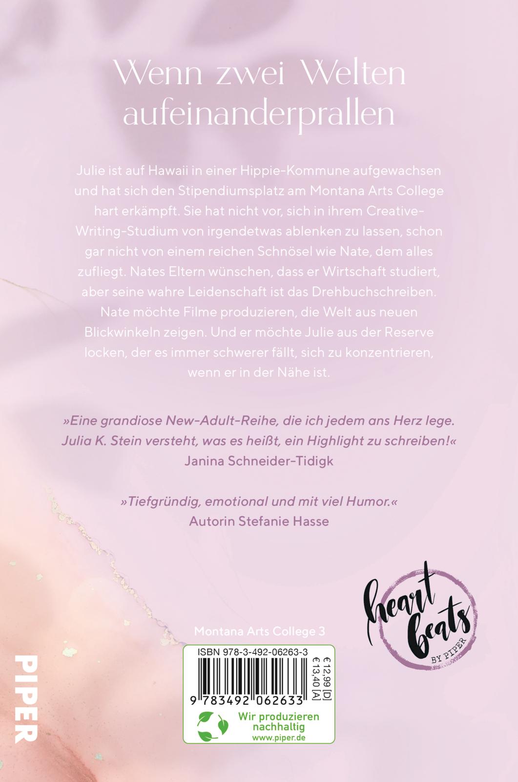 Julie ist auf Hawaii in einer Hippie-Kommune aufgewachsen und hat sich den Stipendiumsplatz am Montana Arts College hart erkämpft. Sie hat nicht vor, sich in ihrem Creative-Writing-Studium von irgendetwas ablenken zu lassen, schon gar nicht von einem reichen Schnösel wie Nate, dem alles zugeflogen kommt. Nates Eltern denken, dass er Wirtschaft studiert, doch seine wahre Leidenschaft liegt im Drehbuch. Er möchte Filme produzieren, die Welt aus neuen Blickwinkeln zeigen. Und er möchte Julie aus der Reserve locken, der es immer schwerer fällt, sich zu konzentrieren, wenn er in der Nähe ist.