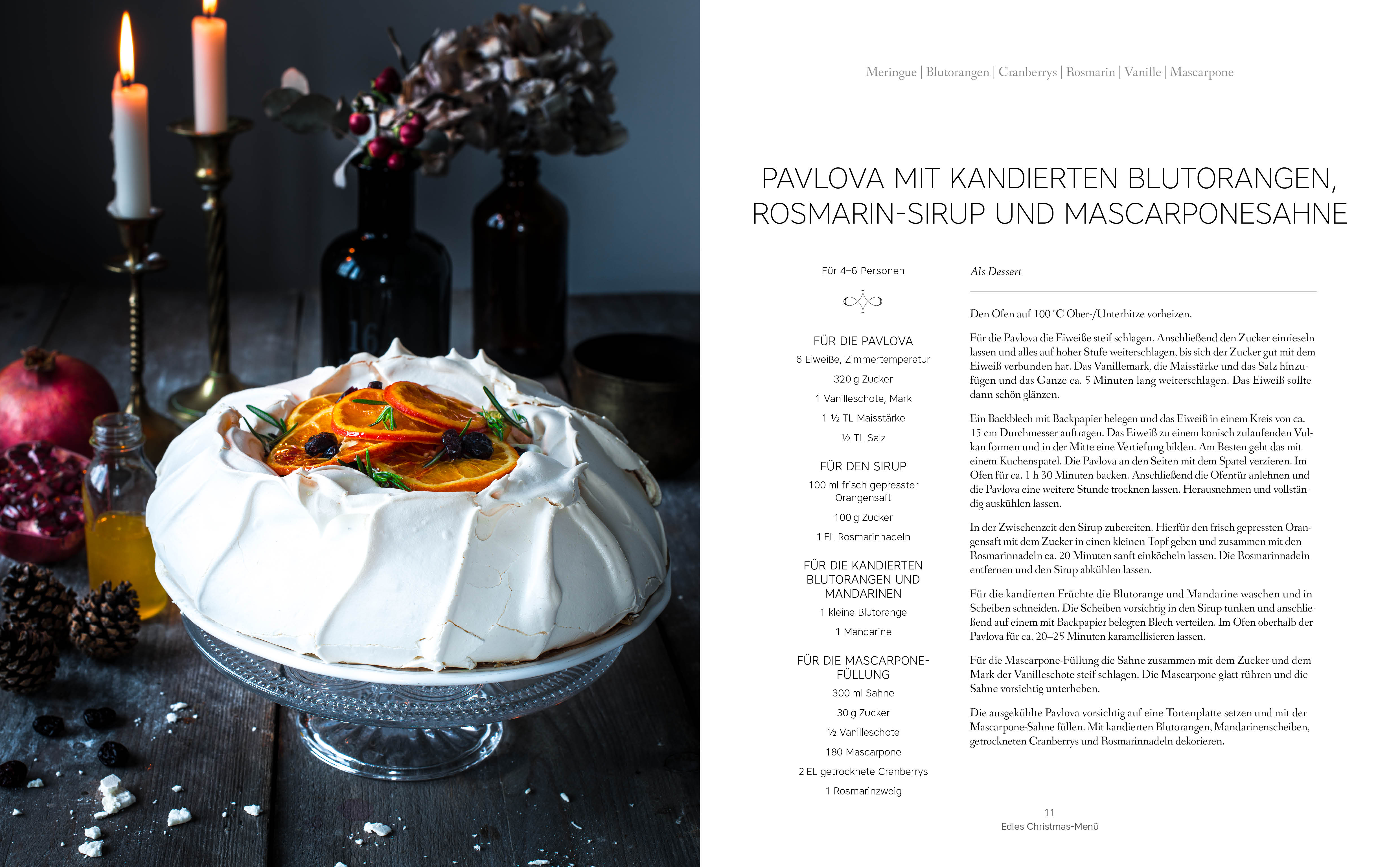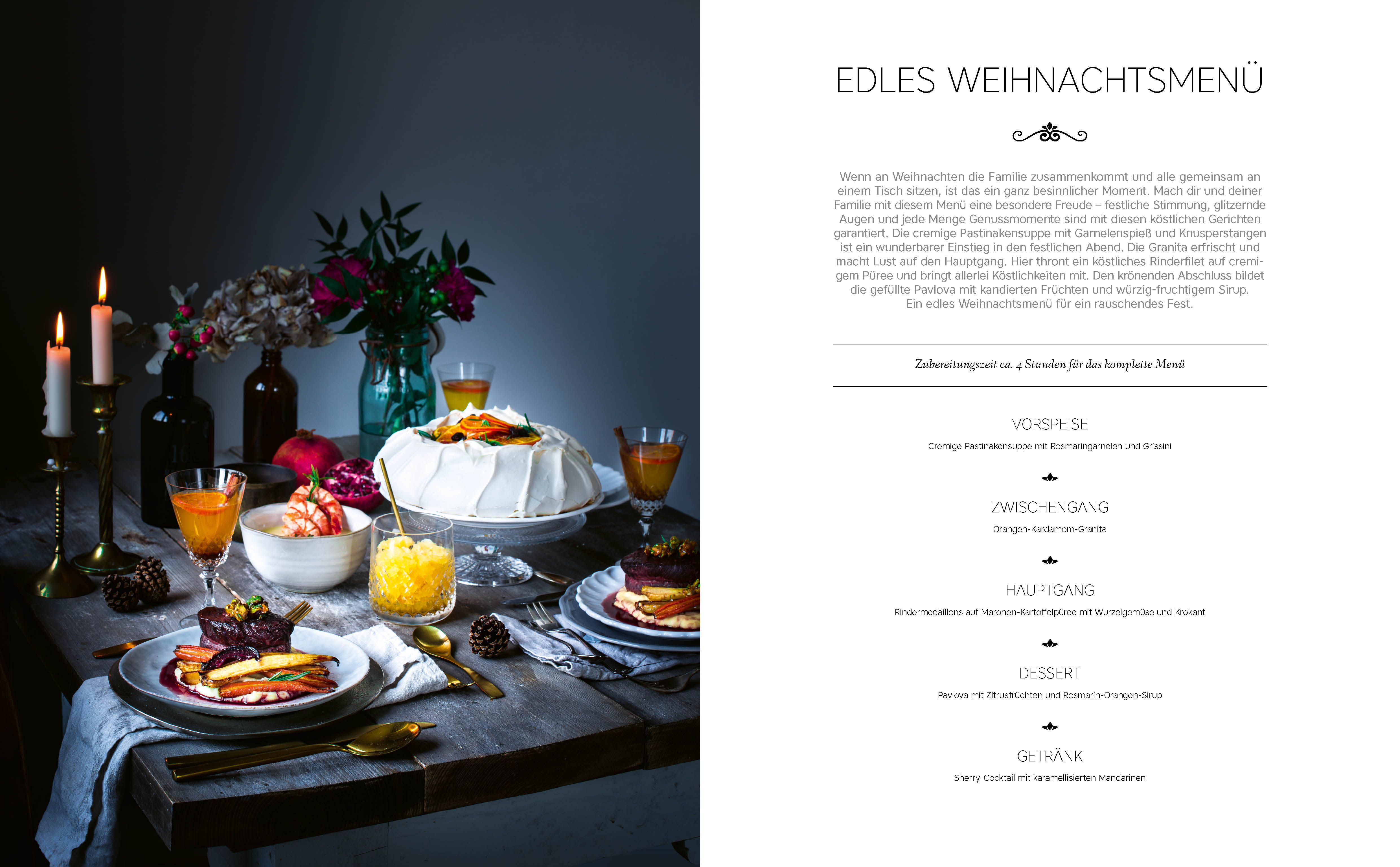 Was gibt es eigentlich Weihnachten? Diese Frage ist ab jetzt schnell zu beantworten. Denn Katharina Küllmer hat 12 festliche Menüs kreiert, die mal klassisch, mal edel, mal schnell zubereitet oder mal ganz figurbewusst, mal mit Fisch, mal mit Fleisch und auch mal vegetarisch und vegan sein können. Insgesamt präsentiert sie über 50 kreative Rezepte für Advent, Weihnachten und Neujahr, wie Rindermedaillons auf Maronen-Kartoffel-Pürree, fruchtiger Spinat-Feta-Salat mit Physalis und Walnusscrunch, Pastinaken-Creme-Suppe mit Vanille-Garnelen und Grissini oder Pavlova mit kandierten Blutorangen und Mascarponesahne.
