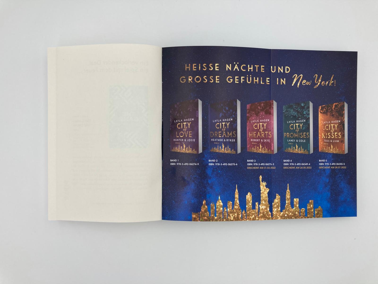 - Beschreibung Die Liebe in der aufregendsten Stadt der Welt!Bei Tag ist Ryker erfolgreicher Banker, abends geht der sexy Gitarrist seiner Leidenschaft für die Musik nach. Bei einem seiner Auftritte trifft er auf die Reporterin Heather. Zwischen den beiden sprühen sofort die Funken. Beide spüren, dass ihre Begegnung mehr ist als ein unbedeutender Flirt. Aber die alleinerziehende Heather zögert: Nach der letzten gescheiterten Beziehung hat sie ihrer kleinen Tochter versprochen, dass sie fortan zu zweit bleiben. Doch Ryker lässt nicht locker und kämpft um Heathers Herz …Verführerisch, leidenschaftlich, sexy – Nach den »Flowers of Passion« und den »Diamonds for Love« meldet sich Bestsellerautorin Layla Hagen mit einer neuen Romance-Reihe zurück!»Einmal angefangen, kann man Layla Hagens Bücher nicht mehr zur Seite legen.« Geneva Lee, Autorin der »Royals«-Serie Alle Bände der »New York Nights«: Band 1: City of Love – Hunter & Josie Band 2: City of Dreams – Heather & Ryker Band 3: City of Hearts – Robert & Skye Band 4: City of Promises – Laney & Cole Band 5: City of Kisses – Tess & Liam
