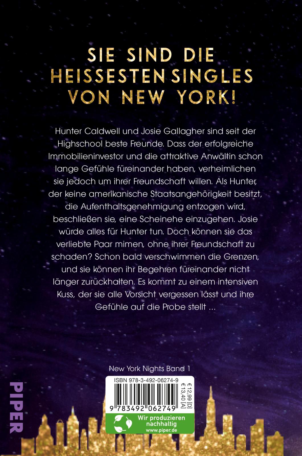 - Beschreibung Das sind die attraktivsten Singles von New York!Josie und Hunter sind seit der Highschool beste Freunde. Dass die ehrgeizige Anwältin und der erfolgreiche Investor seit Jahren Gefühle füreinander haben, verheimlichen sie um ihrer Freundschaft willen. Als dem gebürtigen Engländer das Visum entzogen werden soll, beschließen sie, für drei Jahre eine Scheinehe einzugehen, um Hunter eine Greencard zu besorgen. Doch können sie das verliebte Paar mimen, ohne ihrer Freundschaft zu schaden? Schon während der Hochzeitsreise verschwimmen die Grenzen und ihr Begehren füreinander wächst. Es kommt zu einem Kuss, der sie alle Vorsicht vergessen lässt …Verführerisch, leidenschaftlich, sexy – Nach den »Flowers of Passion« und den »Diamonds for Love« meldet sich Bestsellerautorin Layla Hagen mit einer neuen Romance-Reihe zurück!»Einmal angefangen, kann man Layla Hagens Bücher nicht mehr zur Seite legen.« Geneva Lee, Autorin der »Royals«-Serie Alle Bände der »New York Nights«: Band 1: City of Love – Hunter & Josie Band 2: City of Dreams – Heather & Ryker Band 3: City of Hearts – Robert & Skye Band 4: City of Promises – Laney & Cole Band 5: City of Kisses – Tess & Liam