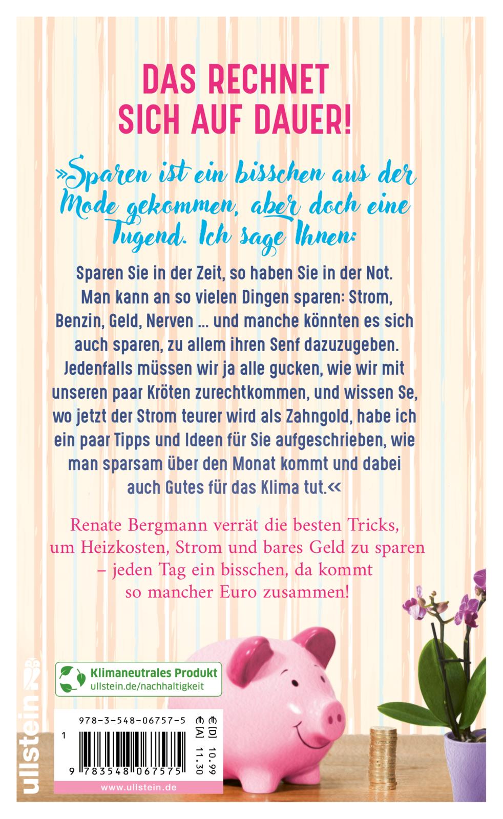 - Beschreibung Das rechnet sich auf Dauer!»Sparen ist ein bisschen aus der Mode gekommen, aber doch eine Tugend. Ich sage Ihnen: Sparen Sie in der Zeit, so haben Sie in der Not. Man kann an so vielen Dingen sparen: Strom, Benzin, Geld, Nerven … und manche könnten es sich auch sparen, zu allem ihren Senf dazu zu geben.Jedenfalls müssen wir ja alle gucken, wie wir mit unseren paar Kröten zurechtkommen, und wissen Se, wo jetzt der Strom teurer wird als Zahngold, habe ich ein paar Tipps und Ideen für Sie aufgeschrieben, wie man sparsam über den Monat kommt und dabei auch Gutes für das Klima tut.«Renate Bergmann verrät die besten Tricks, um Heizkosten, Strom und bares Geld zu sparen – jeden Tag ein bisschen, da kommt so mancher Euro zusammen!