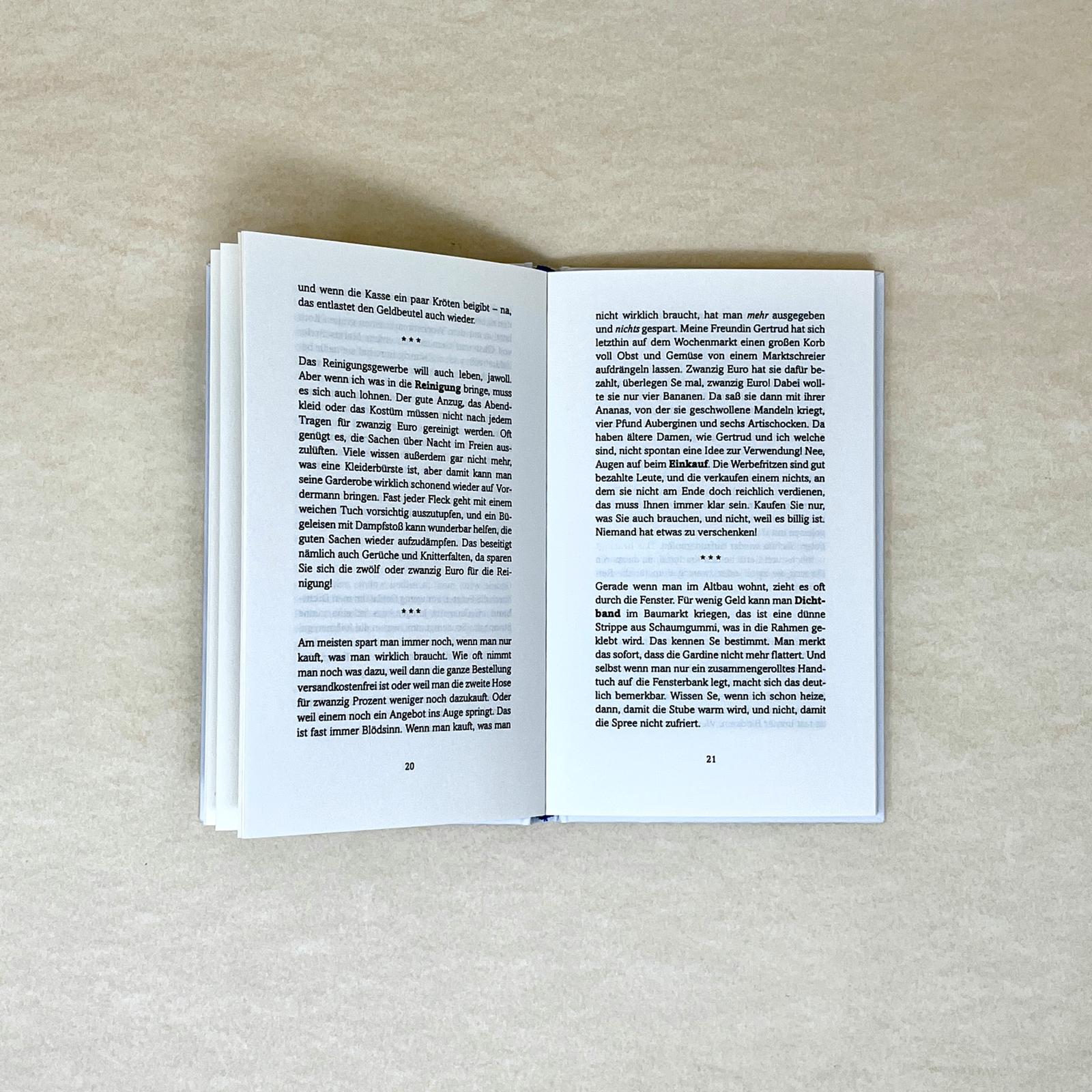 »Sparen ist ein bisschen aus der Mode gekommen, aber doch eine Tugend. Ich sage Ihnen: Sparen Sie in der Zeit, so haben Sie in der Not. Man kann an so vielen Dingen sparen: Strom, Benzin, Geld, Nerven … und manche könnten es sich auch sparen, zu allem ihren Senf dazu zu geben.