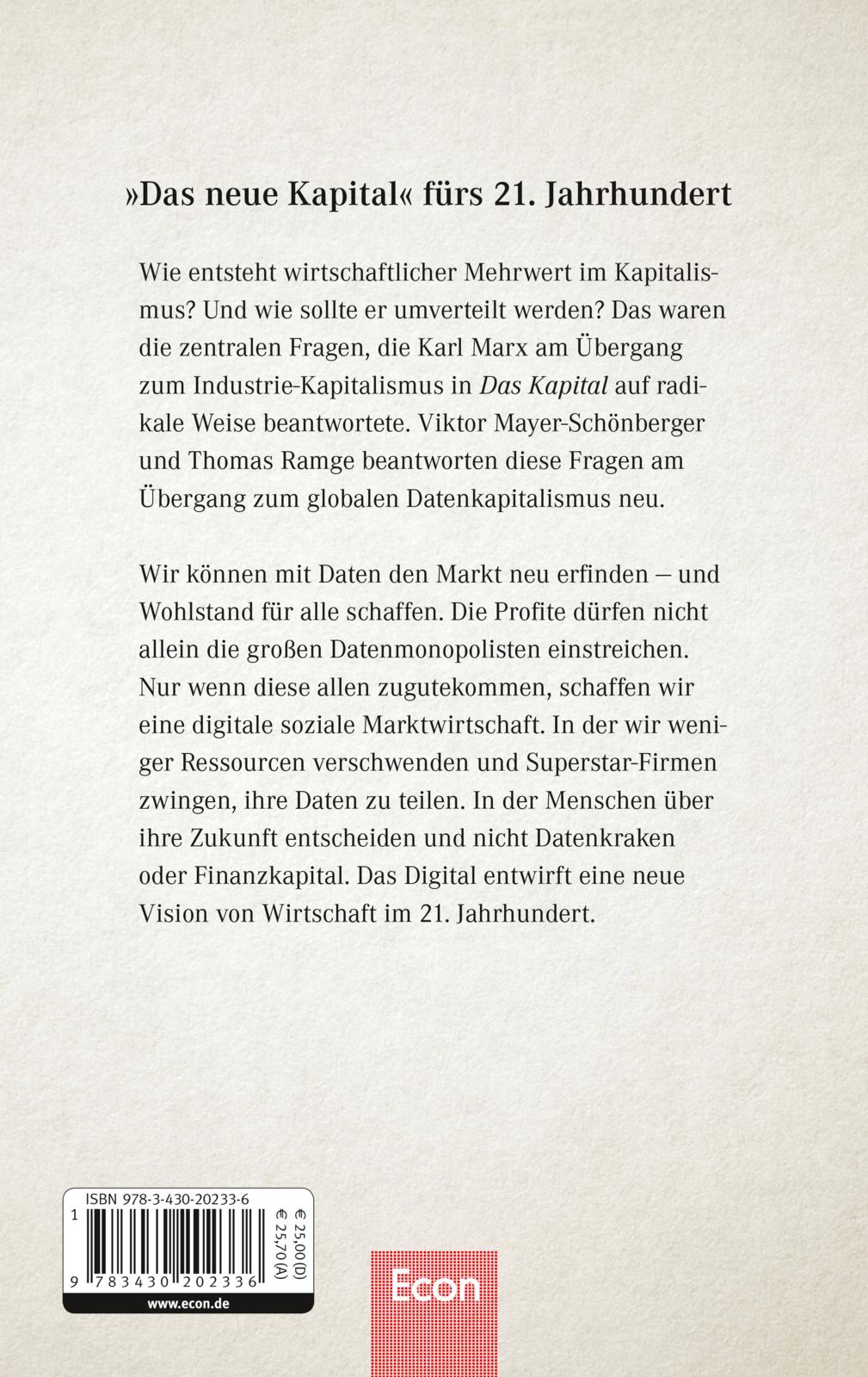 Wie entsteht ökonomischer Mehrwert im Kapitalismus? Und wie sollte er umverteilt werden? Das waren die zentralen Fragen, die Karl Marx am Übergang zum Industrie-Kapitalismus in „Das Kapital“ auf radikale Weise beantwortete. Viktor Mayer-Schönberger und Thomas Ramge beantworten die gleichen Fragen am Übergang zum globalen Datenkapitalismus neu.