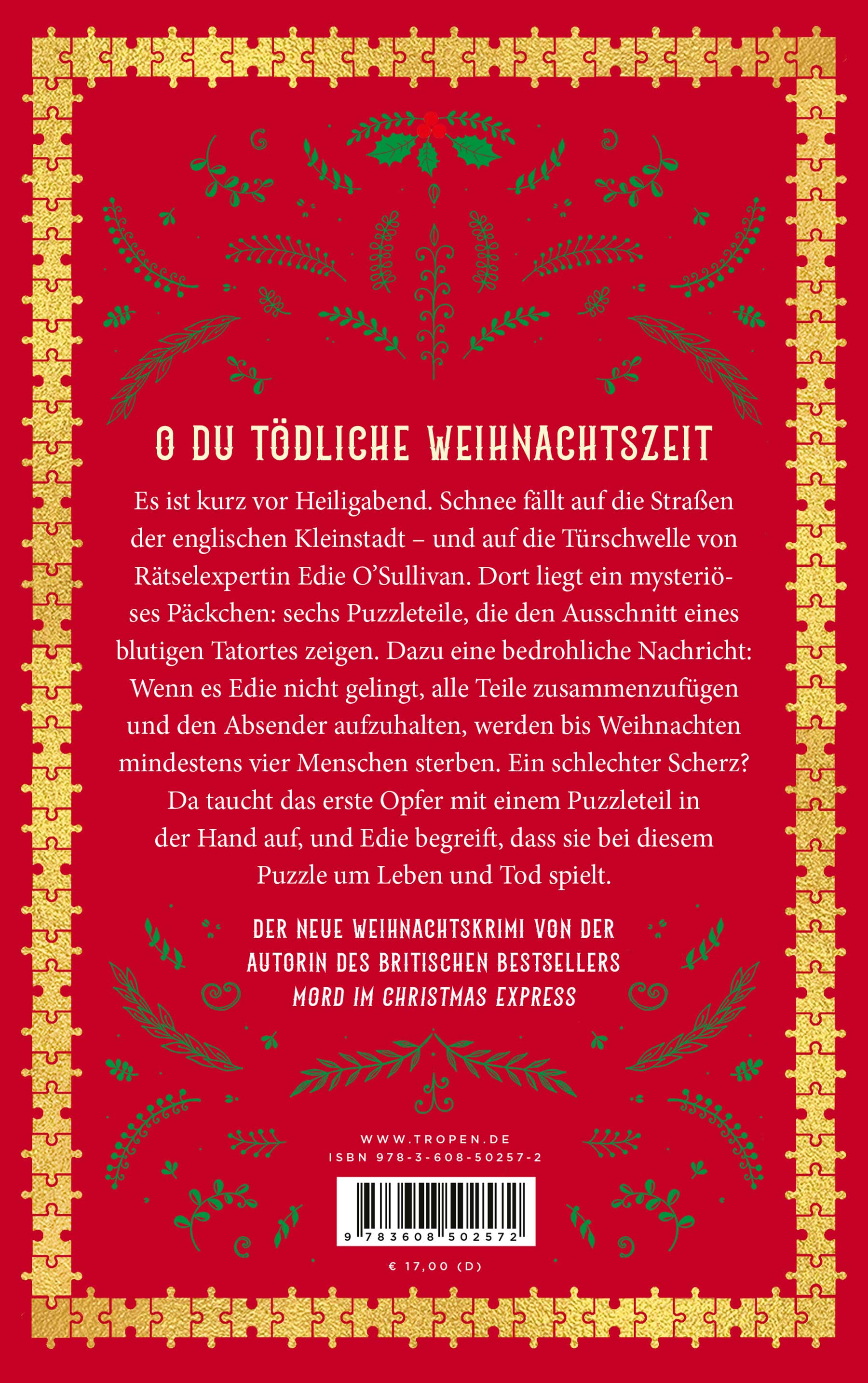 - Beschreibung O du tödliche WeihnachtszeitEs ist kurz vor Heiligabend. Schnee fällt auf die Straßen der englischen Kleinstadt – und auf die Türschwelle von Rätselexpertin Edie O’Sullivan. Dort liegt ein mysteriöses Päckchen: sechs Puzzleteile, die den Ausschnitt eines blutigen Tatortes zeigen. Dazu eine bedrohliche Nachricht: Wenn es Edie nicht gelingt, alle Teile zusammenzufügen und den Absender aufzuhalten, werden bis Weihnachten mindestens vier Menschen sterben. Ein schlechter Scherz? Da taucht das erste Opfer mit einem Puzzleteil in der Hand auf, und Edie begreift, dass sie bei diesem Puzzle um Leben und Tod spielt.Der neue Weihnachtskrimi von der Autorin des britischen Bestsellers Mord im Christmas Express»Mindestens vier Menschen werden bis Heiligabend um Mitternacht den Tod gefunden haben, wenn Sie es nicht schaffen, alle Teile zusammenzusetzen und mich aufzuhalten.« Mit diesen Worten auf einer Weihnachtskarte ist die besinnliche Adventszeit für die Rentnerin und Weihnachtshasserin Edie O’Sullivan vorüber. Ein unbekannter Absender hat sie geschickt, ebenso wie sechs Puzzleteile, die zusammengelegt den Ausschnitt eines Tatortes ergeben. Entsetzt sucht Edie Rat bei ihrem Großneffen Sean, einem Polizisten. Sie ahnt, dass sie nicht zufällig ausgewählt wurde, schließlich gilt sie als eine der größten Rätselexpertinnen des Landes. Doch da taucht bereits das erste Opfer mit einem Puzzleteil in der Hand auf. Sean will ohne Edie weiterermitteln, aber die alte Dame lässt nicht locker. Unbeirrt puzzelt sie weiter. Je näher sie der Lösung kommt, desto mehr führen die Hinweise in Edies Vergangenheit und zu einem Geheimnis, das sie tief vergraben glaubte.