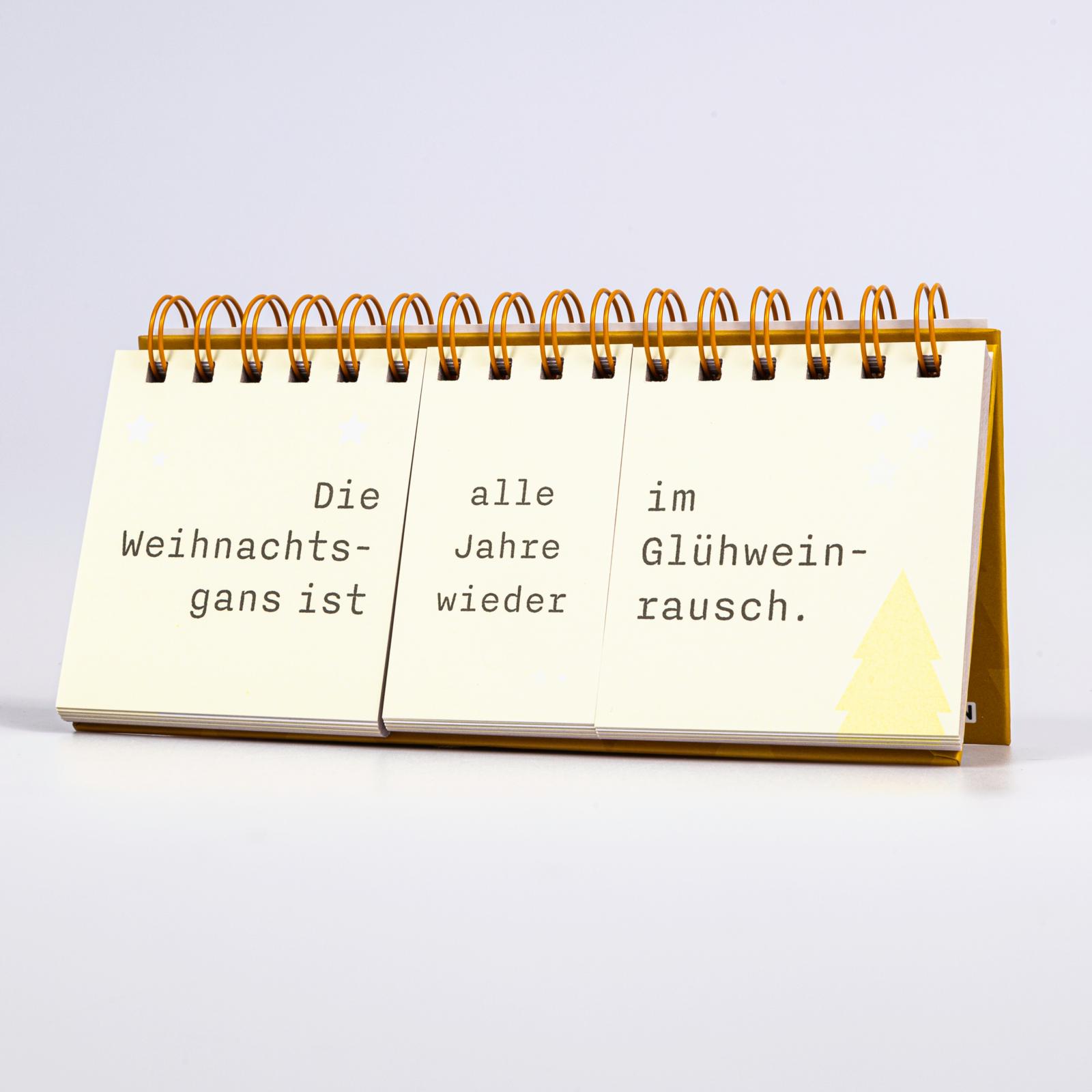 Mit diesem Phrasen-Generator für die Adventszeit lässt sich der stressige Jahresendspurt mit viel Humor bewältigen, ob im Büro, zu Gast bei Freunden oder zu Hause! Mithilfe des schicken Aufstellers mit drei Klappsegmenten lassen sich in null Komma nichts bis zu 110.000 witzige Sätze und Sprüche rund um die Weihnachtszeit kreieren.