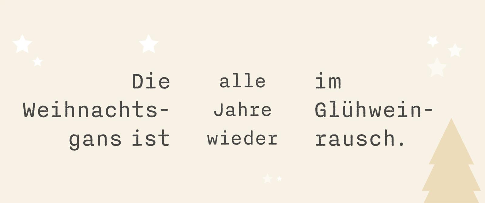 - Beschreibung Mit diesem Phrasen-Generator für die Adventszeit lässt sich der stressige Jahresendspurt mit viel Humor bewältigen, ob im Büro, zu Gast bei Freunden oder zu Hause! Mithilfe des schicken Aufstellers mit drei Klappsegmenten lassen sich in null Komma nichts bis zu 110.000 witzige Sätze und Sprüche rund um die Weihnachtszeit kreieren.Bestens geeignet als Wichtelgeschenk für die lieben Kollegen oder als lustiges Weihnachtsgeschenk für Freunde und die ganze Familie. Besinnliches Beömmeln im Büro und unterm Weihnachtsbaum!