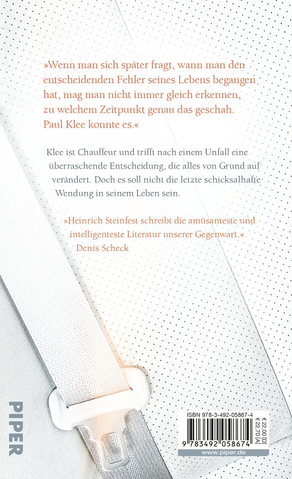 In der Welt des Chauffeurs Paul Klee herrschen Übersicht und Präzision. Aber das Leben hält keine Garantie für unendliche Ordnung bereit: Nach einem schweren Autounfall und einer nicht minder schweren Fehlentscheidung beschließt er, ein kleines Hotel ganz nach seinen Vorstellungen zu führen. Und das Glück will es, dass er sich in die Maklerin Inoue verliebt. Also planen sie das Haus gemeinsam, von den Zimmern bis zur Bar, von den Sesseln bis zum Frühstück. Aber Klees ideale Welt zerbricht ein zweites Mal - und er entschließt sich zu einem für ihn sehr überraschenden Schritt ... "Der Chauffeur" ist Heinrich Steinfests intensivster Roman und die Geschichte eines Mannes, den die Liebe und der Tod einmal zu oft behelligen.