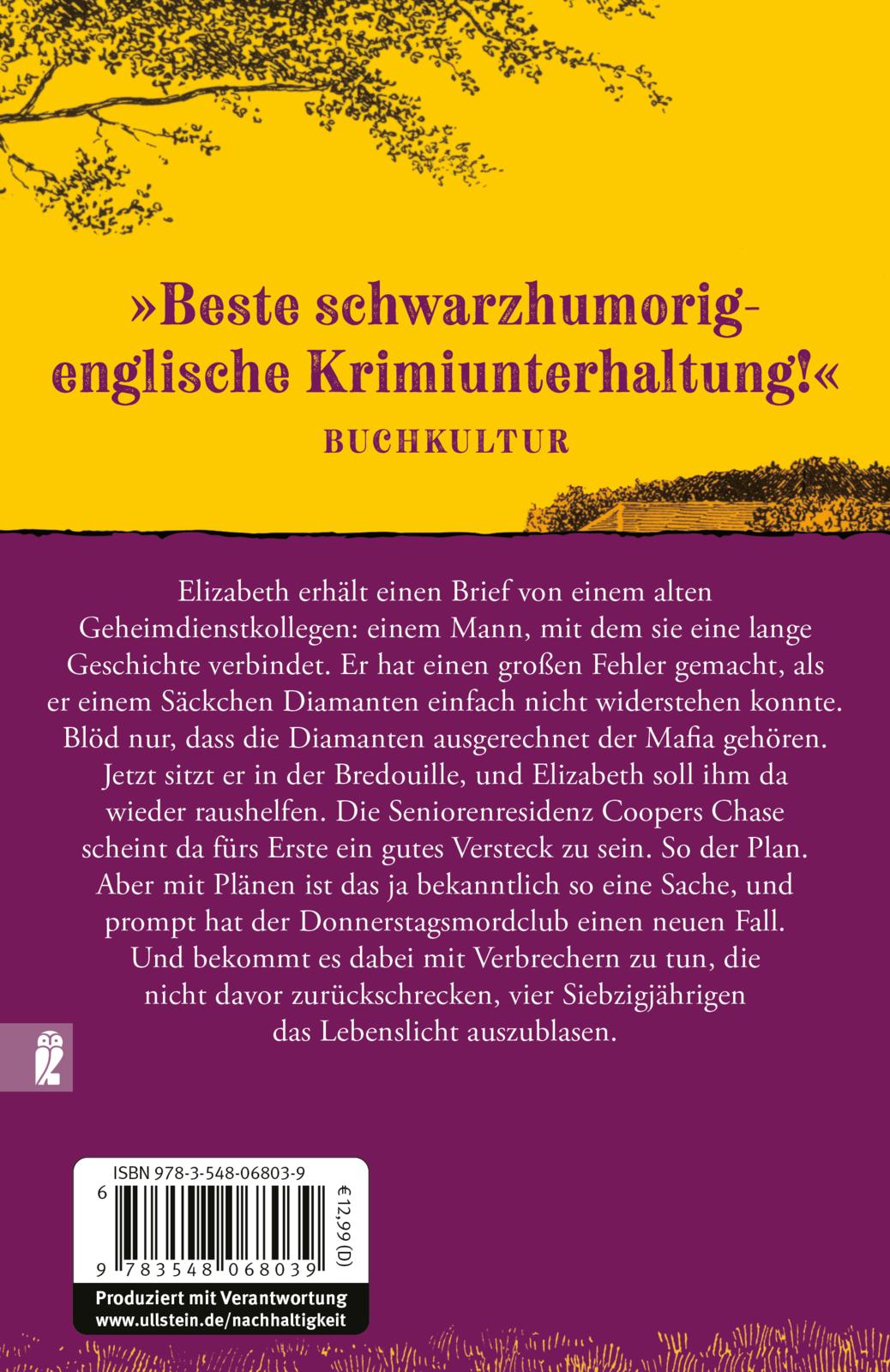 - Beschreibung Nach dem Weltbestseller Der Donnerstagsmordclub der zweite Fall für das scharfsinnigste Seniorenquartett der KrimigeschichteDa hat er sich in etwas reingeritten, der gute Marcus Carmichael. Und jetzt soll Elizabeth ihm da wieder raushelfen. Dabei sollte ihr ehemaliger Geheimdienst-Kollege doch eigentlich wissen, von wem man besser keine Diamanten mitgehen lässt, wenn man sich gerade auf einem Einsatz für den MI5 befindet. Dazu gehört ganz bestimmt: die New Yorker Mafia. Ist die erst einmal im Spiel, geht es ziemlich sicher bald jemandem an den Kragen.Doch auch Profimörder können Fehler machen, etwa ihrem Handwerk in der Seniorenresidenz Coopers Chase nachzugehen. Denn wer hier mordet, dem ist der Donnerstagsmordclub auf den Fersen, und der macht, schneller als ihm lieb sein kann, aus dem Jäger den Gejagten. Für die vier rüstigen Senioren heißt es: Endlich ist wieder Donnerstag!»Eine triumphale Rückkehr des Donnerstagsmordclubs.« Wall Street Journal»Osman hat es nicht nur wieder getan, er hat es sogar noch besser gemacht.« Philippa Perry