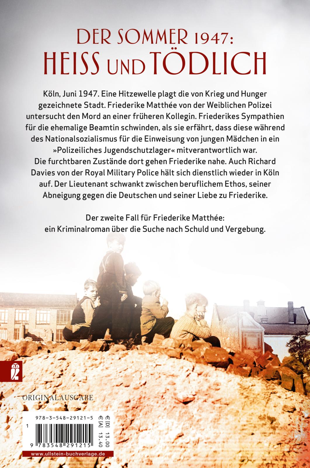 Köln, Juni 1947. Eine Hitzewelle plagt die von Krieg und Hunger gezeichnete Stadt. Friederike Matthée von der Weiblichen Polizei untersucht den Mord an einer früheren Kollegin. Die Beamtin überwachte während des Nationalsozialismus die Unterbringung von Kindern und Jugendlichen in Polizeilichen Jugendschutzlagern. Die Zustände dort gehen Friederike nahe, Erinnerungen an ihre Flucht aus Ostpreußen werden in ihr wach. Der Fall bringt sie und Richard Davies von der Royal Military Police wieder zusammen. Der Offizier Richard schwankt zwischen beruflichem Ethos und seinem Hass auf die Deutschen. Friederike überschreitet einmal mehr ihre Befugnisse, um den Fall aufzuklären.