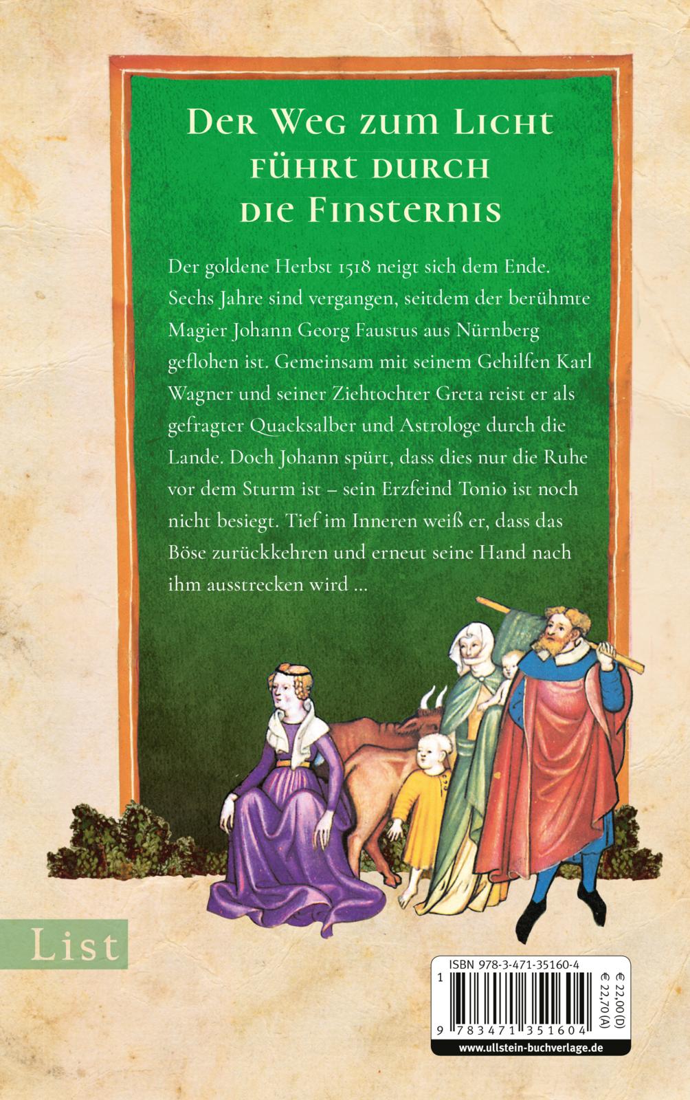 Der goldene Herbst 1518 neigt sich dem Ende. Sechs Jahre sind vergangen, seitdem der berühmte Magier Johann Georg Faustus aus Nürnberg geflohen ist. Sein Ruhm ist gewachsen, selbst an den Höfen von Herzögen, Grafen und Bischöfen sucht man seinen Rat. So als würde der Herrgott – oder sein böser Gegenspieler? – eine schützende Hand über ihn halten. Gemeinsam mit seinem neuen Gefährten Karl Wagner und der jungen Gauklerin Greta, seiner Ziehtochter, reist er als Quacksalber und Astrologe durch die Lande. Doch Johann spürt, dass dies nur die Ruhe vor dem Sturm ist. Sein Erzfeind Tonio ist noch nicht besiegt. Tief im Inneren weiß Johann, dass das Böse zurückkehren und erneut seine Hand nach ihm ausstrecken wird …