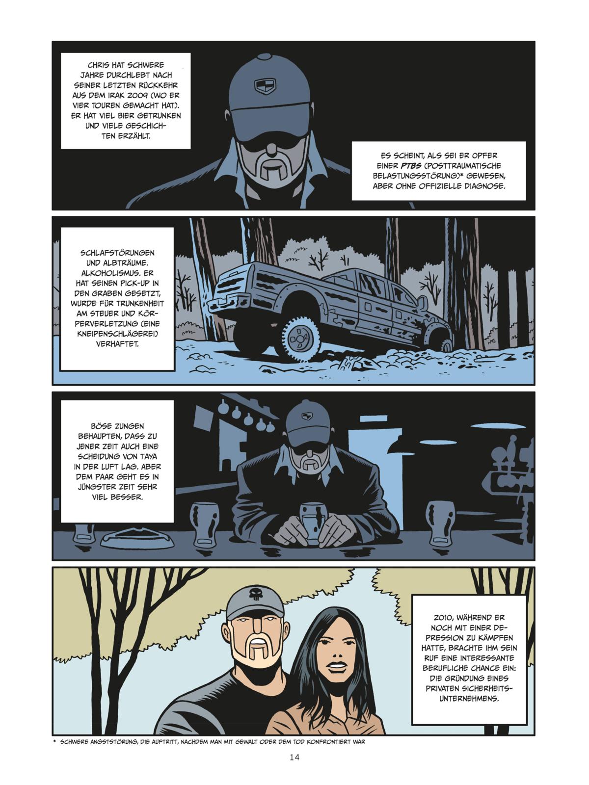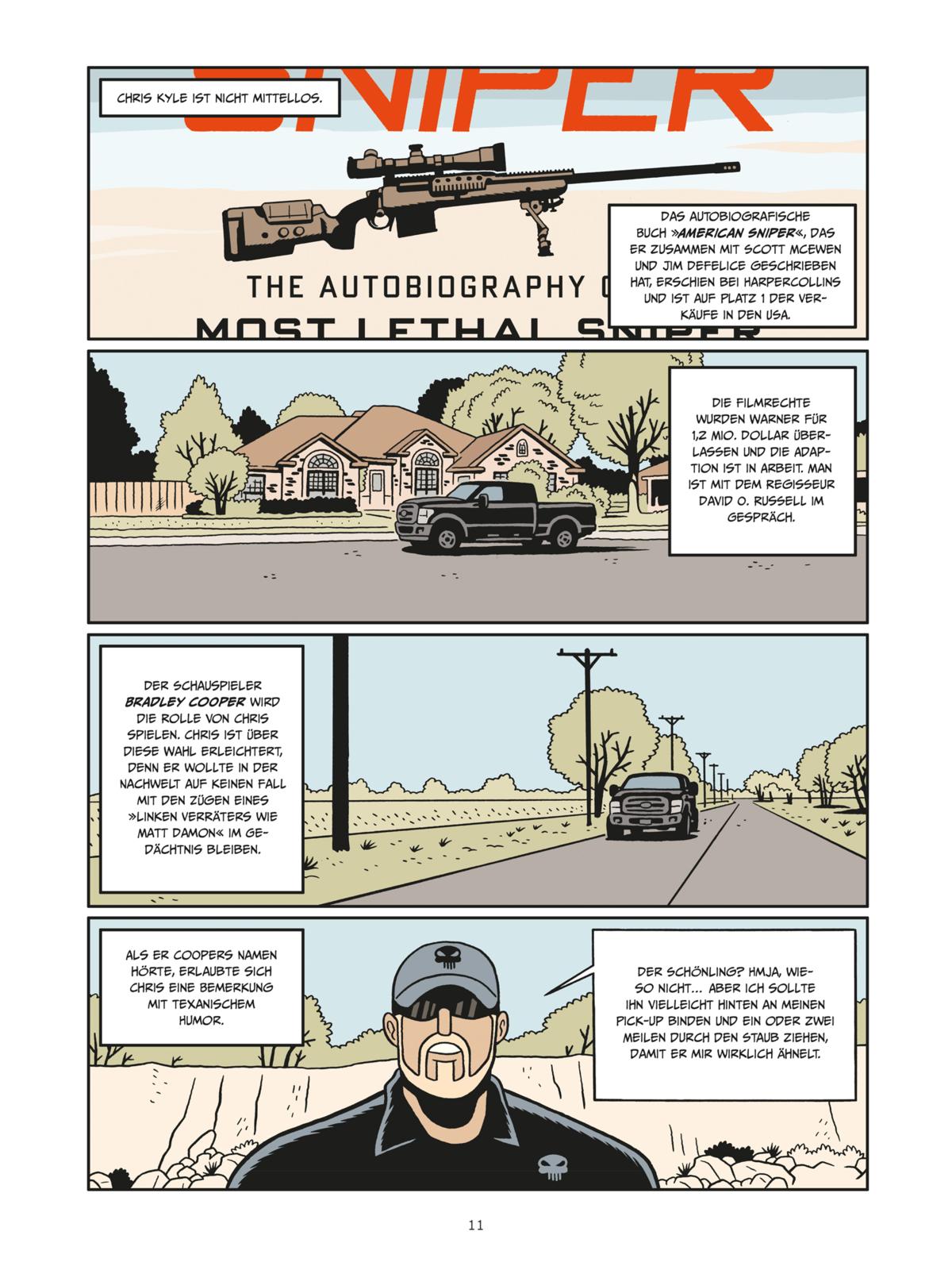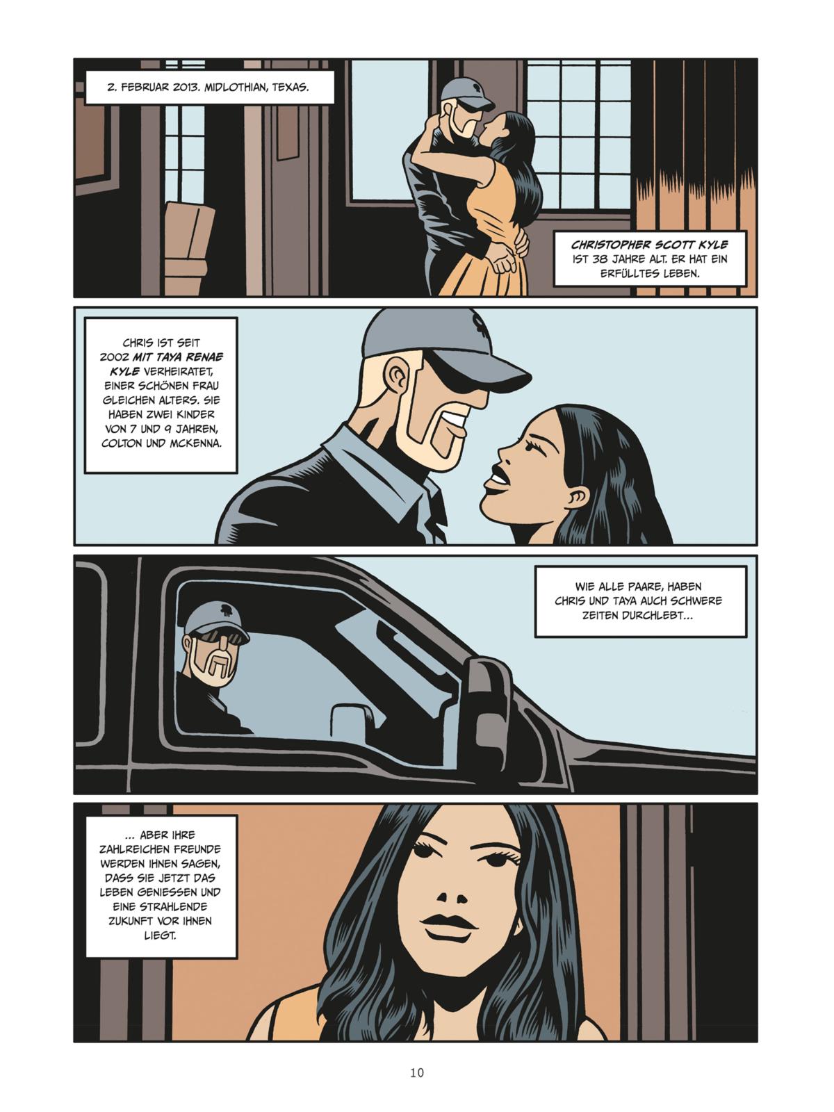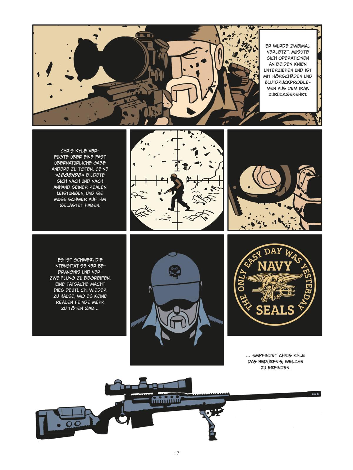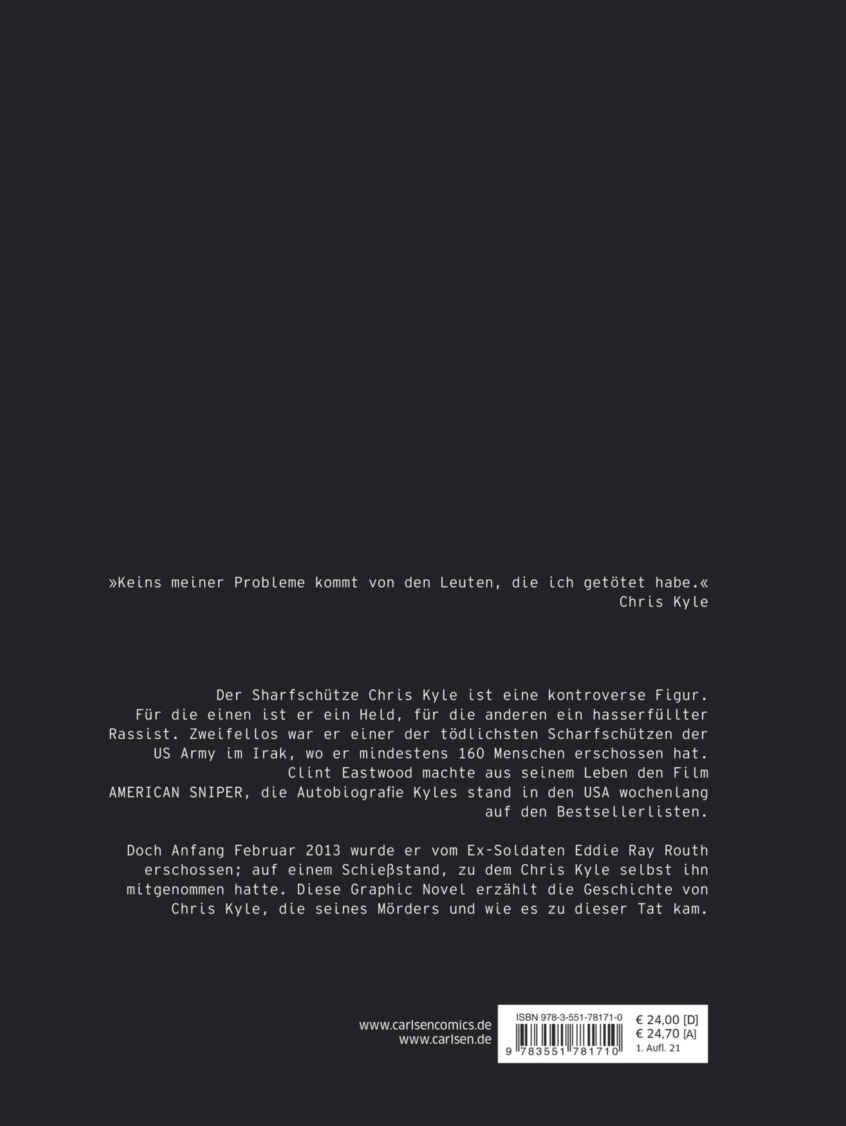Doch Anfang Februar 2013 wurde er vom Ex-Soldaten Eddie Ray Routh erschossen; auf einem Schießstand, zu dem Chris Kyle selbst ihn mitgenommen hatte. Diese Graphic Novel erzählt die Geschichte von Chris Kyle, die seines Mörders und wie es zu dieser Tat kam. In ihren kontroversen Figuren finden sich viele Widersprüche unserer Zeit vereint, und es bleibt den Leser*innen selbst überlassen, sich darüber ein Urteil zu bilden. Dieser Band bietet dafür jede Menge spannendes Material.