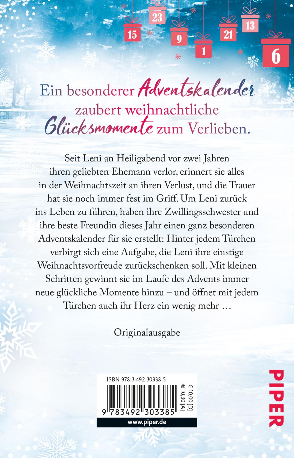 Seit Leni an Heiligabend vor zwei Jahren ihren geliebten Ehemann verlor, erinnert sie alles in der Weihnachtszeit an ihren Verlust, und die Trauer hat sie noch immer fest im Griff. Um Leni zurück ins Leben zu führen, haben ihre Zwillingsschwester Marie und ihre beste Freundin Emma deshalb dieses Jahr einen ganz besonderen Adventskalender für sie erstellt: Hinter jedem Türchen verbirgt sich eine Aufgabe, die Leni jene Weihnachtsvorfreude wieder näherbringen soll, die sie früher so begeistert ausgelebt hat. Dabei erhält sie Unterstützung von ihrer Familie und ihren Freunden – und bald auch von ihrem Nachbarn Erik, dem sie mit jedem Türchen langsam ihr Herz ein wenig mehr öffnet …