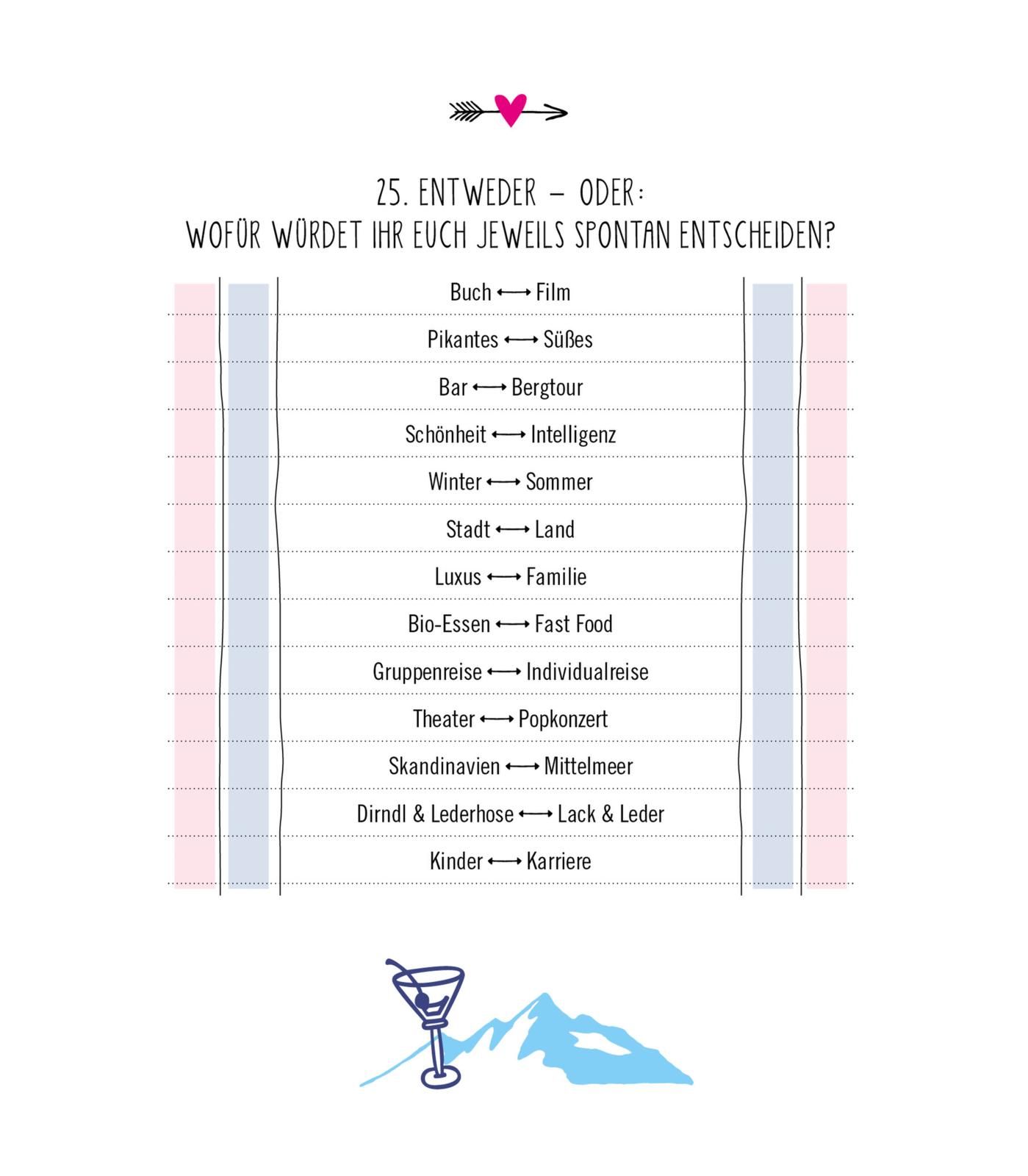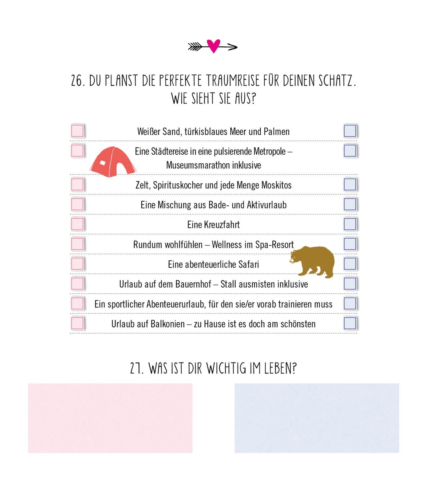 Liebe muss nicht perfekt sein, sondern echt. In diesem Liebes-Test findet ihr heraus, wie gut ihr zusammenpasst. Egal ob ihr in vielem übereinstimmt oder ob die Ecken des einen zu den Kanten des anderen passen – dieser Test bietet jede Menge Spaß und die Möglichkeit, sich noch besser kennenzulernen. 111 lustige, hintergründige und spannende Fragen laden zum Raten, Staunen und Lachen ein. Als charmanter Zeitvertreib zu zweit – im Urlaub, an Jubiläen oder einfach so zwischendurch.
