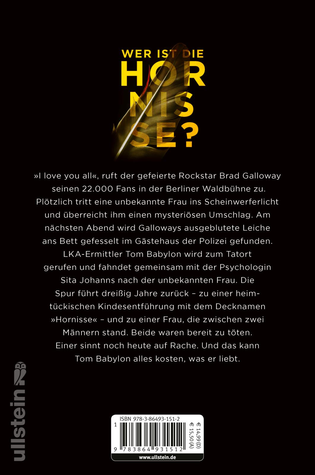 LKA-Ermittler Tom Babylon sucht gemeinsam mit der Psychologin Sita Johanns nach der Unbekannten. Die Spur führt dreißig Jahre zurück – zu einer heimtückischen Kindesentführung mit dem Decknamen »Hornisse« – und zu einer Frau, die zwischen zwei Männern stand. Beide waren bereit zu töten. Einer sinnt noch heute auf Rache. Und das kann Tom Babylon alles kosten, was er liebt.