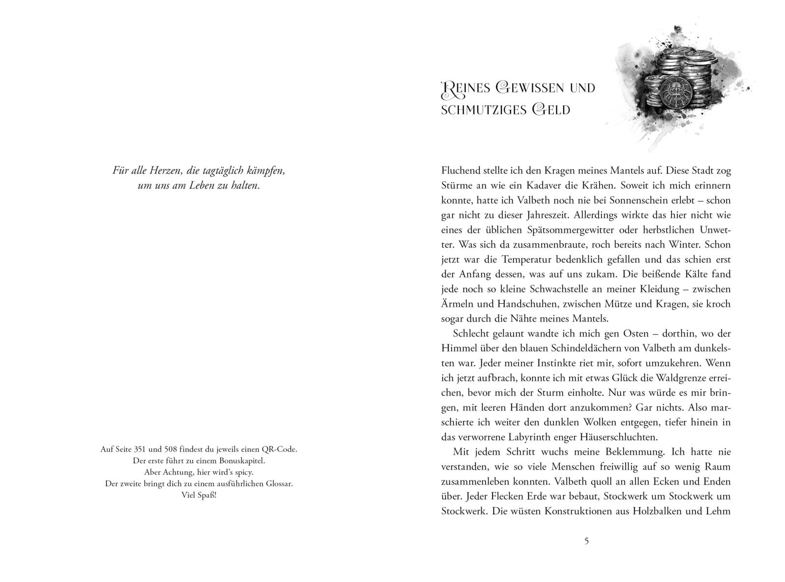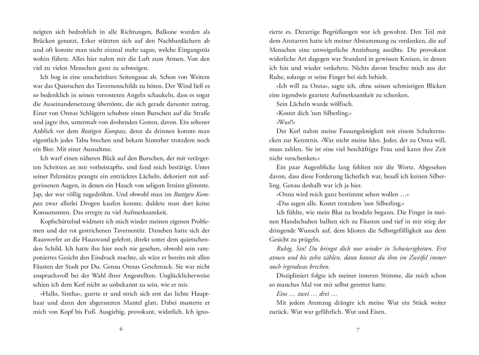 Städte, Siedlungen und Straßen gehören den Menschen, die Wälder jedoch sind das Reich der Qidhe, der magischen Wesen. So will es das umstrittene und streng durchgesetzte Friedensabkommen. Aber Sintha pfeift auf diese Gesetze. Halb Mensch, halb Qidhe muss sie sich ohnehin mit dem Misstrauen beider Welten herumschlagen – besonders mit dem der Vakàr, einem dunklen magischen Volk, das die Einhaltung des Friedensabkommens erbarmungslos überwacht. Als eines Tages ein Schneesturm aufzieht und Sintha gezwungen ist, in einem menschlichen Gasthof Schutz zu suchen, ändert sich für sie alles. Denn in dem eingeschneiten Dörfchen ist ein Mord geschehen und ausgerechnet der gefürchtete Anführer der Vakàr ist gekommen, um ihn aufzuklären. Mit Sintha im Sturm gefangen, wirft Arezander nun jedoch nicht nur ein Auge auf ihre ganz speziellen Fähigkeiten …