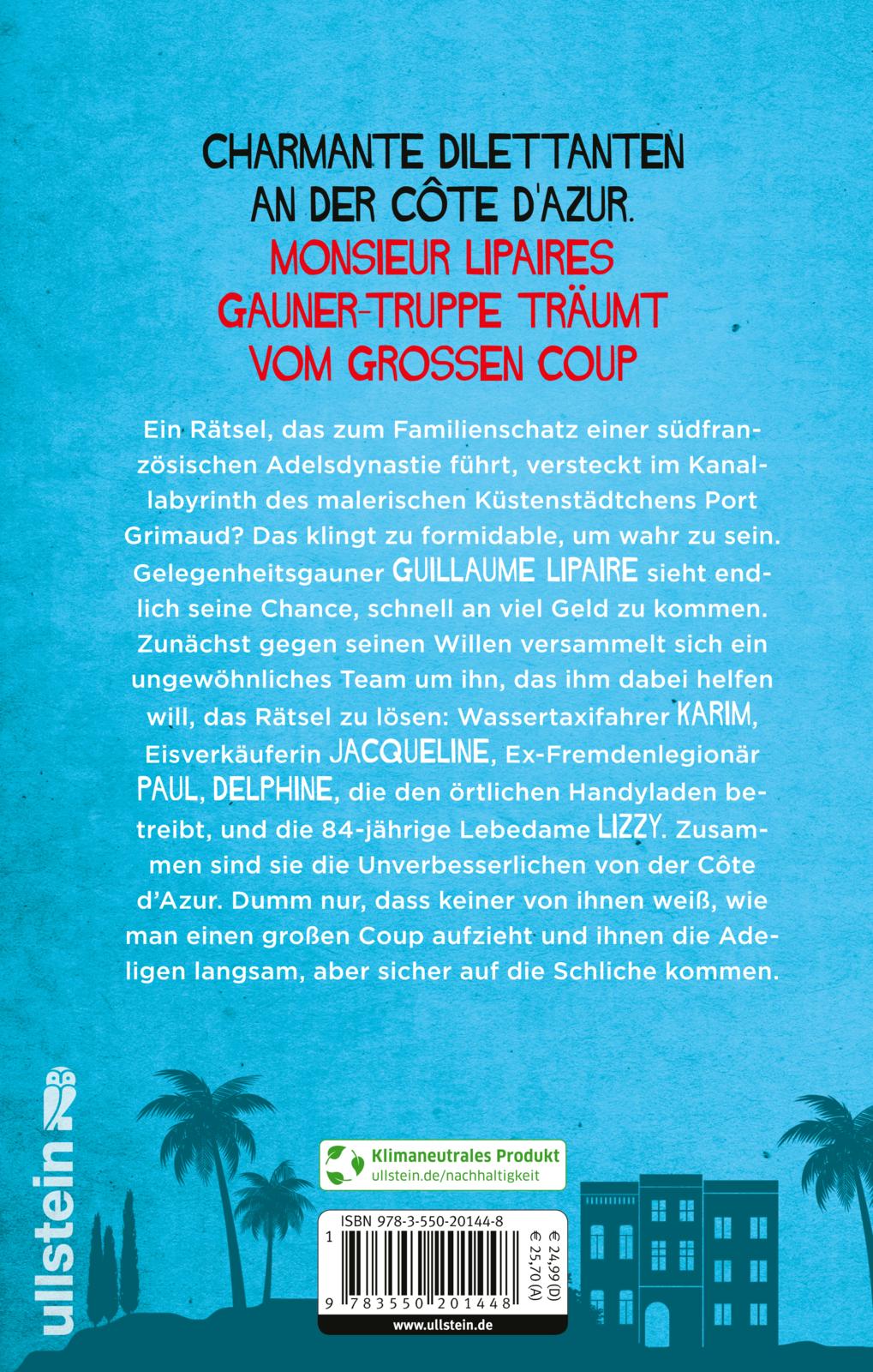 Ein Rätsel, das zum Familienschatz einer südfranzösischen Adelsdynastie führt, versteckt im Kanallabyrinth der malerischen Küstenstadt Port Grimaud? Das klingt zu formidable, um wahr zu sein. Gelegenheitsgauner Guillaume Lipaire sieht endlich seine Chance, schnell an viel Geld zu kommen. Er versammelt ein ungewöhnliches Team um sich, das ihm dabei helfen soll, das Rätsel zu lösen: Wassertaxifahrer Karim, Eisverkäuferin Jacqueline, Ex-Fremdenlegionär Paul, Delphine, die den örtlichen Handyladen betreibt, und die 84-jährige Lebedame Lizzy. Zusammen sind sie die Unverbesserlichen von der Côte d’Azur. Dumm nur, dass keiner von ihnen weiß, wie man einen großen Coup aufzieht und ihnen die Adeligen langsam, aber sicher auf die Schliche kommen. Ein turbulentes Katz-und-Maus-Spiel durch den pittoresken Urlaubsort beginnt, bei dem eine Katastrophe die nächste jagt.