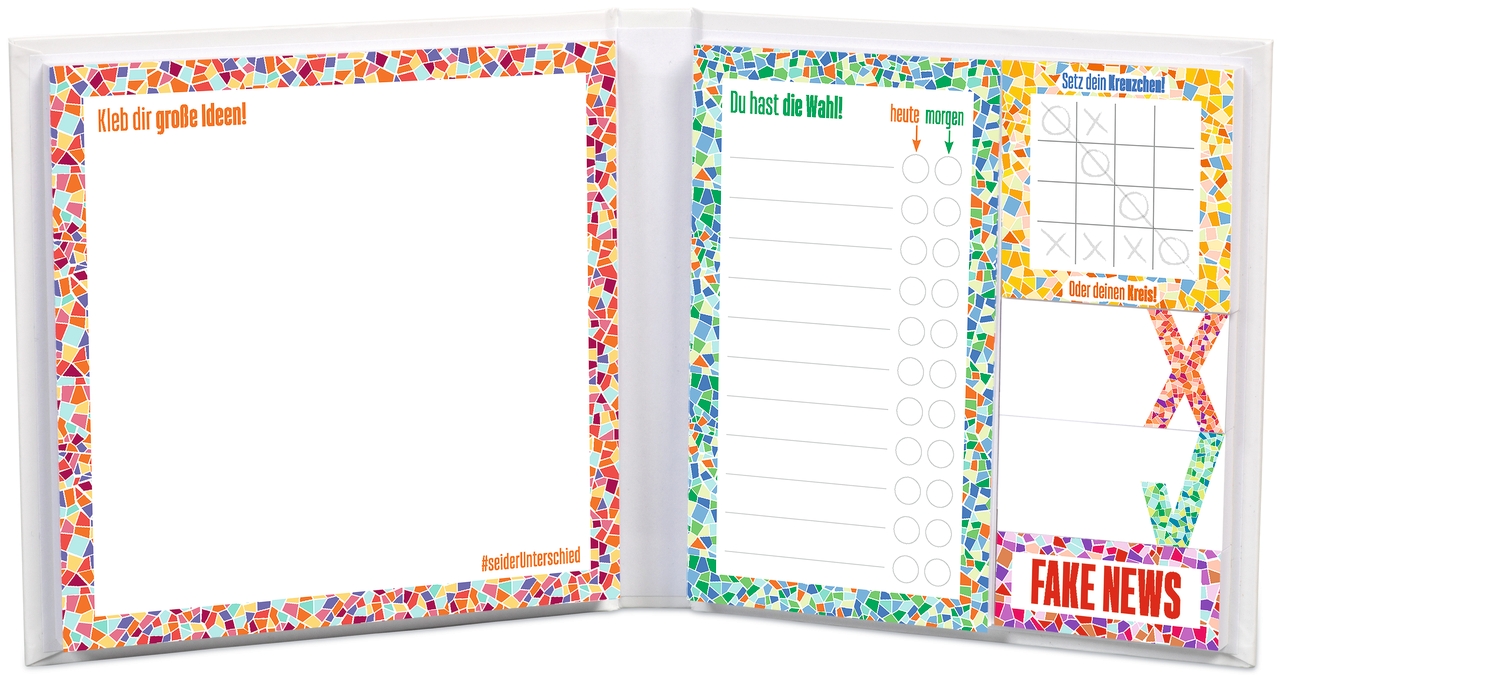 - Quadratisches Klebezettelbuch mit 6 Blöcken à 50 Blatt, vierfarbig illustriert.