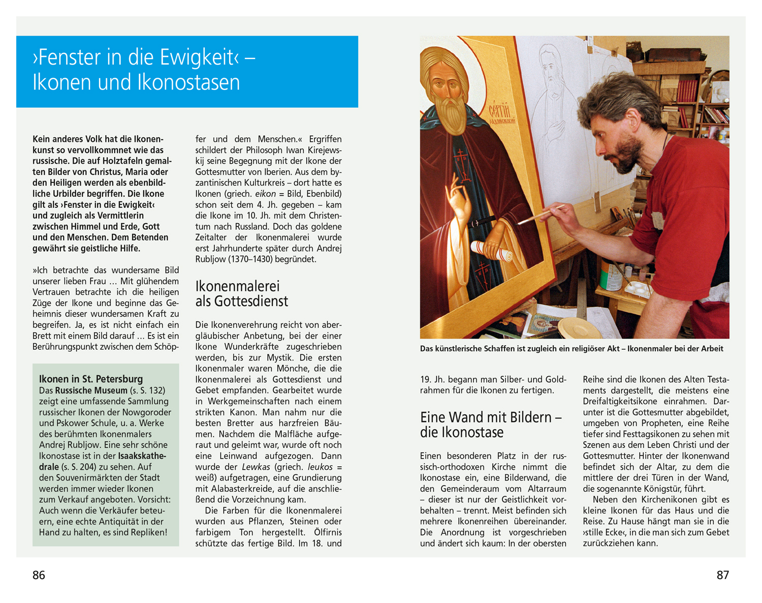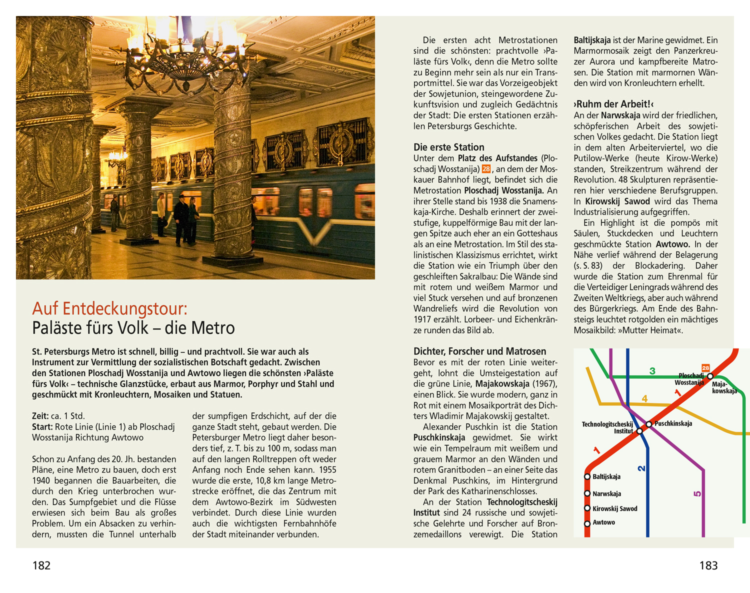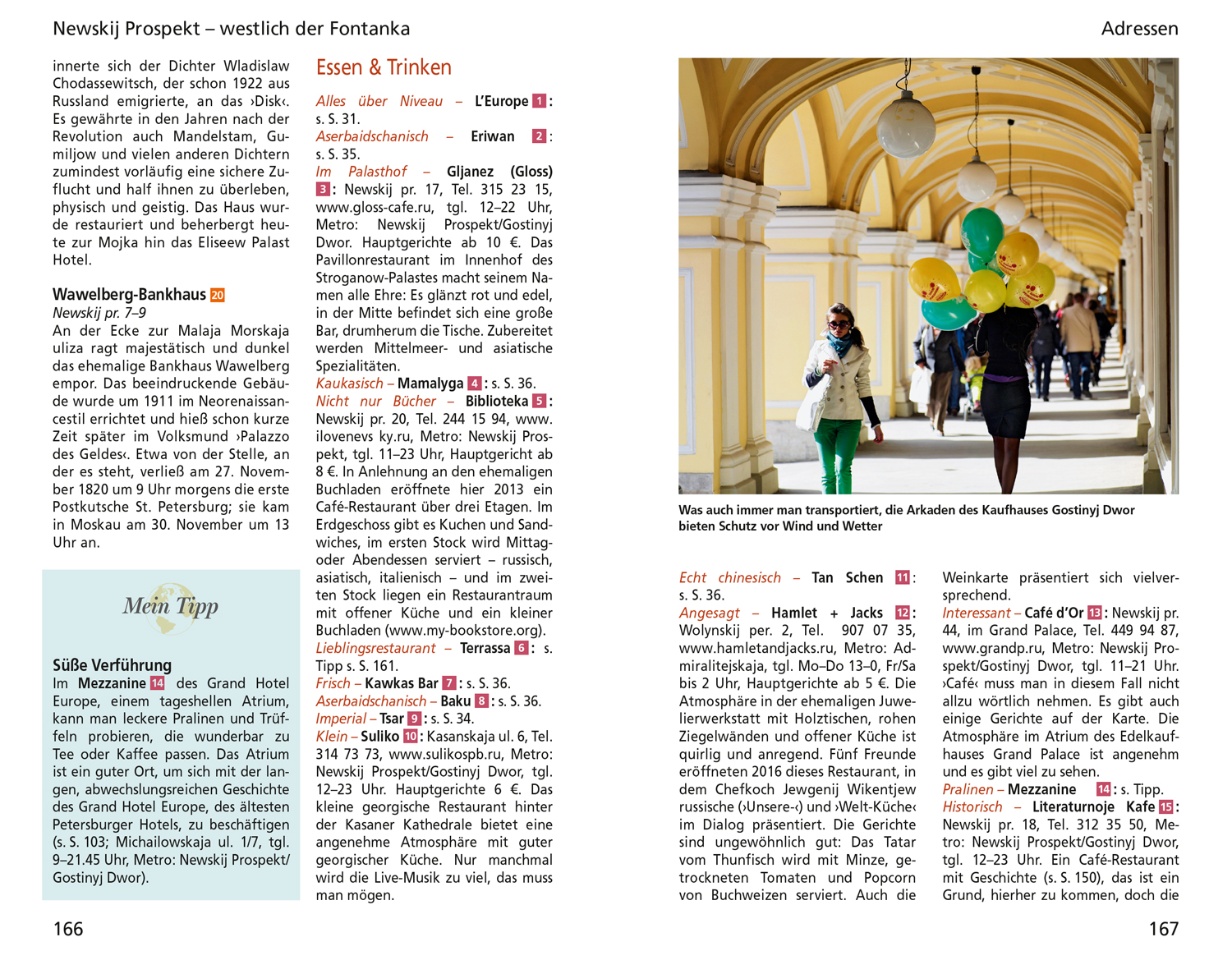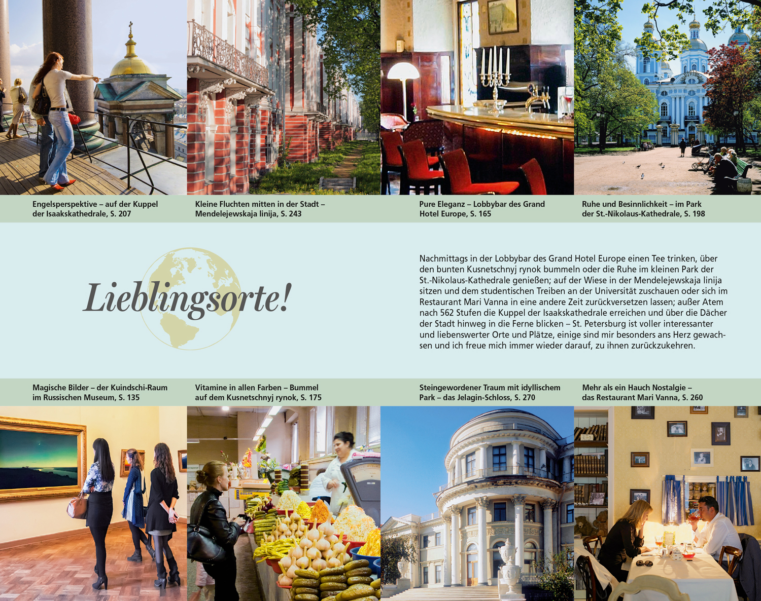 St. Petersburg ist mit seinen fantastischen Palästen, prächtigen Kirchen und romantischen Brücken ein einzigartiges Freilichtmuseum der Architektur. Wo liegen die schönsten Aussichtspunkte? Welche Museen sollte man unbedingt besuchen? Wie lässt sich die Newa-Metropole per Boot erkunden? Diese und andere Fragen beantwortet Autorin Eva Gerberding gleich auf den ersten Seiten des Dumont Reise-Taschenbuchs St. Petersburg. Sie führt die Leser zu Highlights wie dem Smolnyj-Kloster oder dem Mariinskij-Theater und zeigt ihnen ihre ganz persönlichen Lieblingsorte, Plätze und Locations, die ihr über die Jahre besonders ans Herz gewachsen sind, z.B. den farbenprächtigen Markt Kusnetschnyj rynok und das nostalgische Restaurant Mari Vanna. Zehn Entdeckungstouren – u.a. zu den Impressionisten in der Eremitage, zu den Schauplätzen von Dostojewskijs Roman „Schuld und Sühne“ sowie zu jungen Petersburger Modedesignern – eröffnen den Lesern ungewöhnliche Blicke hinter die Kulissen und versorgen sie mit spannenden Details aus Historie und Gegenwart.
