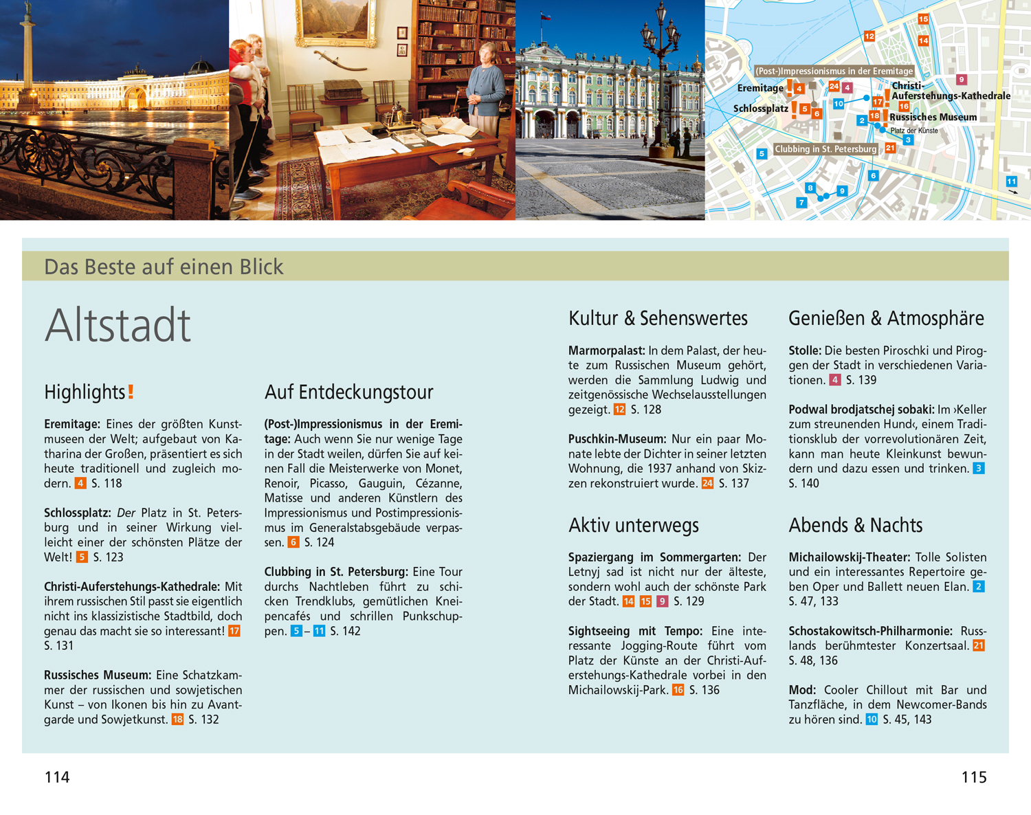 Dass sich Stadtbesichtigung und Erholung nicht ausschließen müssen, beweisen die Aktivtouren: Wie wäre es mit einer Joggingtour am Gribojedow-Kanal entlang oder einer Radtour vom Moskauer Bahnhof zum Schlossplatz? In der aktualisierten Auflage stellt die Autorin das neu eröffnete Kulturzentrum Neuholland auf einer ehemaligen Werftanlage und das schillernde Carl-Fabergé-Museum vor, in dem die traditionellen Ostereier bewundert werden können. Außerdem verrät sie, wo man kulinarische Köstlichkeiten der neu erblühenden russischen Küche genießen kann. Eine rasche Orientierung ermöglichen die detaillierte Extra-Reisekarte im Maßstab 1 : 23.000, eine Übersichtskarte mit den Highlights von St. Petersburg sowie 20 präzise Citypläne und Tourenkarten. Aktuelle Ergänzungen zur laufenden Auflage präsentiert die Autorin auf www.dumontreise.de/st-petersburg.