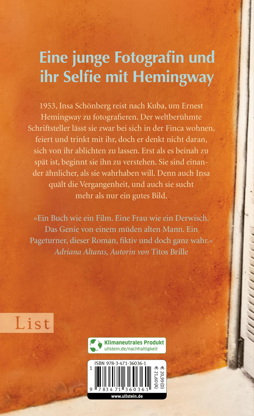 1953, Insa Schönberg reist nach Kuba, um Ernest Hemingway zu fotografieren. Der weltberühmte Schriftsteller lässt sie zwar bei sich in der Finca wohnen, feiert und trinkt mit ihr, doch er denkt nicht daran, sich von ihr ablichten zu lassen. Erst als es beinah zu spät ist, beginnt sie ihn zu verstehen. Sie sind einander ähnlicher, als sie wahrhaben will. Denn auch Insa quält die Vergangenheit, und auch sie sucht mehr als nur ein gutes Bild.