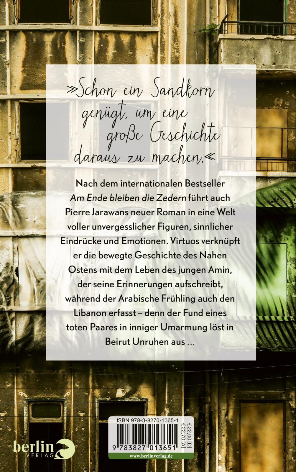 Nach dem internationalen Bestseller Am Ende bleiben die Zedern führt auch Pierre Jarawans neuer Roman in eine Welt voller unvergesslicher Figuren, sinnlicher Eindrücke und Emotionen, einfühlsam, spannend und virtuos verknüpft mit der bewegten Geschichte des Nahen Ostens.
