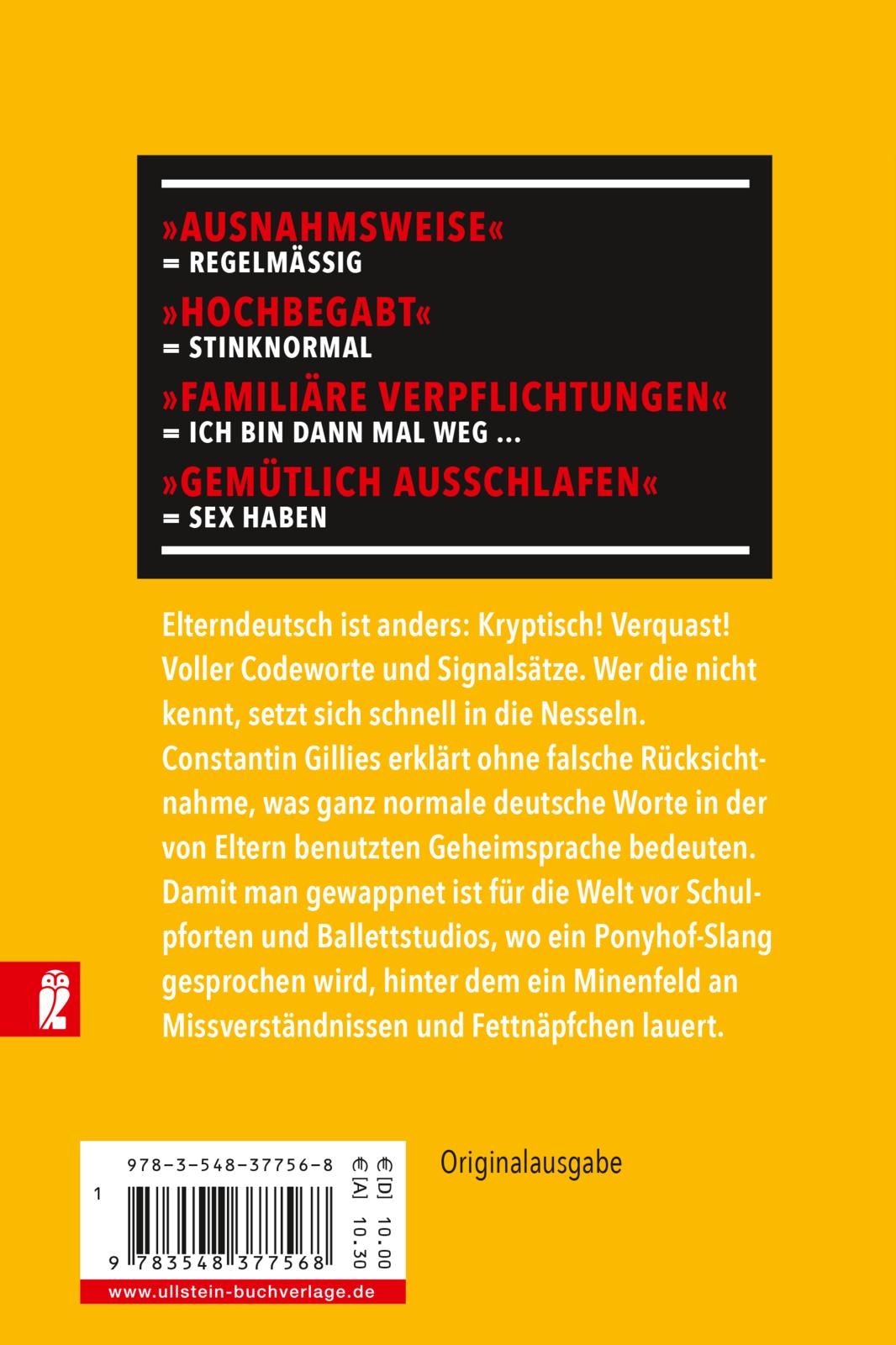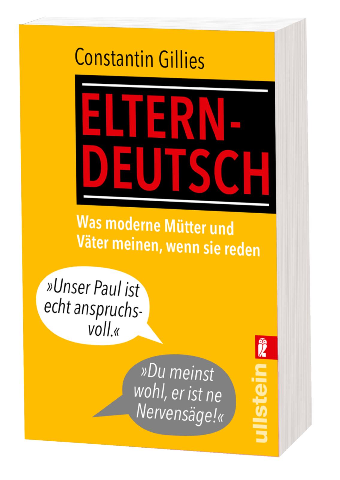 Das Deutsch moderner Mütter und Väter ist anders: Kryptisch! Verquast! Voller Codeworte und Signalsätze. Wer die nicht kennt, setzt sich schnell in die Nesseln. Von „Ausnahmweise“ (immer) über „hochbegabt“ (stinknormal) bis „Ziehdasjetzan!“ (Ich dreh gleich durch...) erklärt Constantin Gillies ohne falsche Rücksichtnahme, was ganz normale Worte in der von Eltern benutzen Geheimsprache bedeuten. Damit man gewappnet ist, wenn man sich in die Welt der Spielplätze, Schulpforten und Ballettstudios begibt, wo Eltern und die Früchte ihrer Lenden das Sagen haben und unterhalb des Ponyhof-Slangs ein Minenfeld an Missverständnissen und Fettnäpfchen lauert.