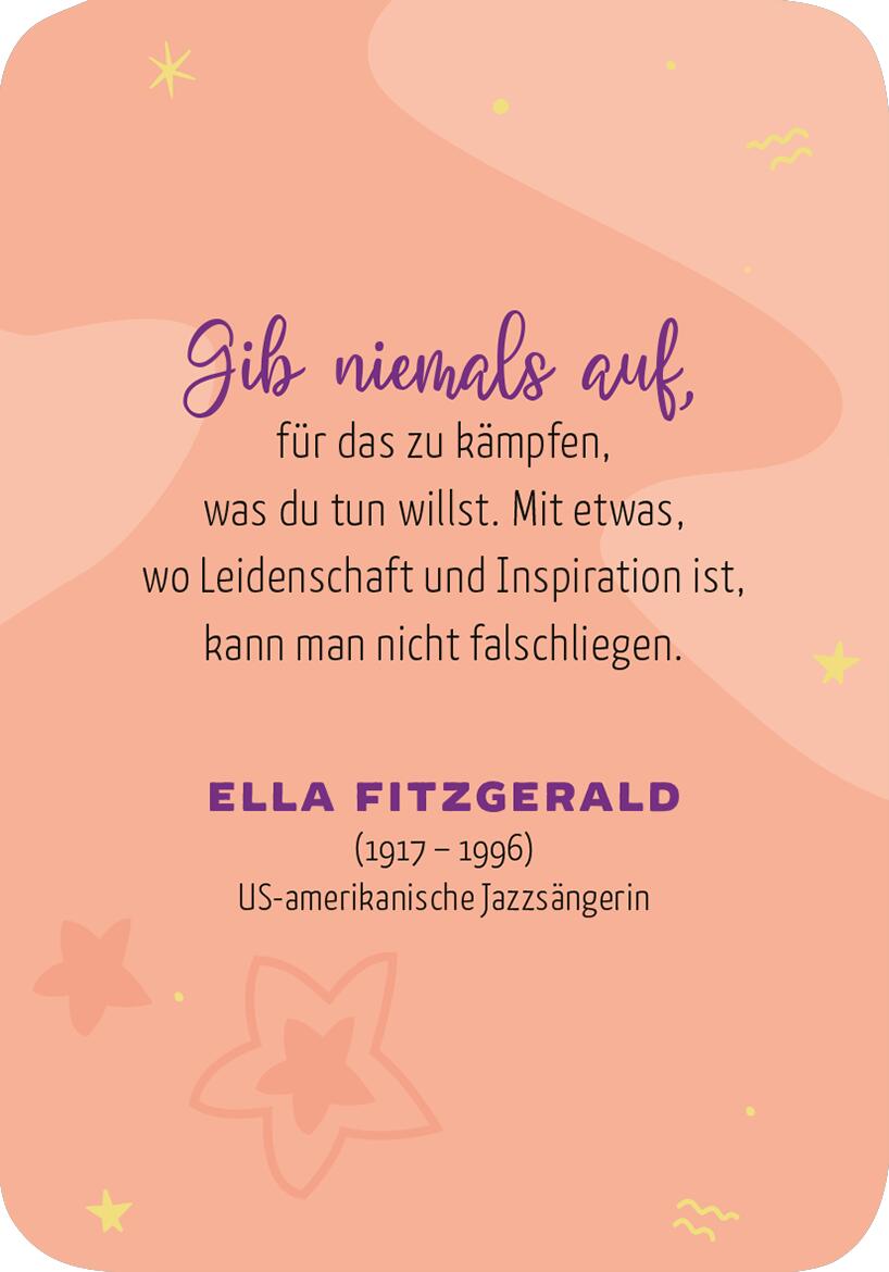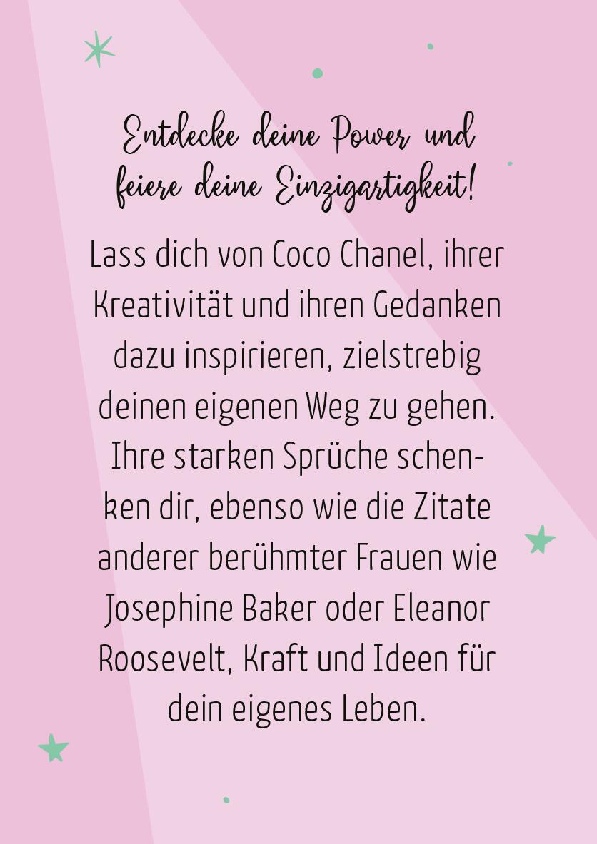 Coco Chanel kann uns auch heute dazu inspirieren, zielstrebig unseren eigenen Weg zu gehen. Nicht nur ihr Werdegang, auch viele ihrer Zitate sind legendär – und ebenso die starken Sprüche anderer erfolgreicher Frauen wie Josephine Baker, Ella Fitzgerald oder Eleanor Roosevelt, die mit vielen weiteren in dieser wunderschön gestalteten Box versammelt sind. Lass dich motivieren von großen Gedanken berühmter Frauen und gewinne aus ihnen Kraft und Ideen für dein eigenes Leben!
