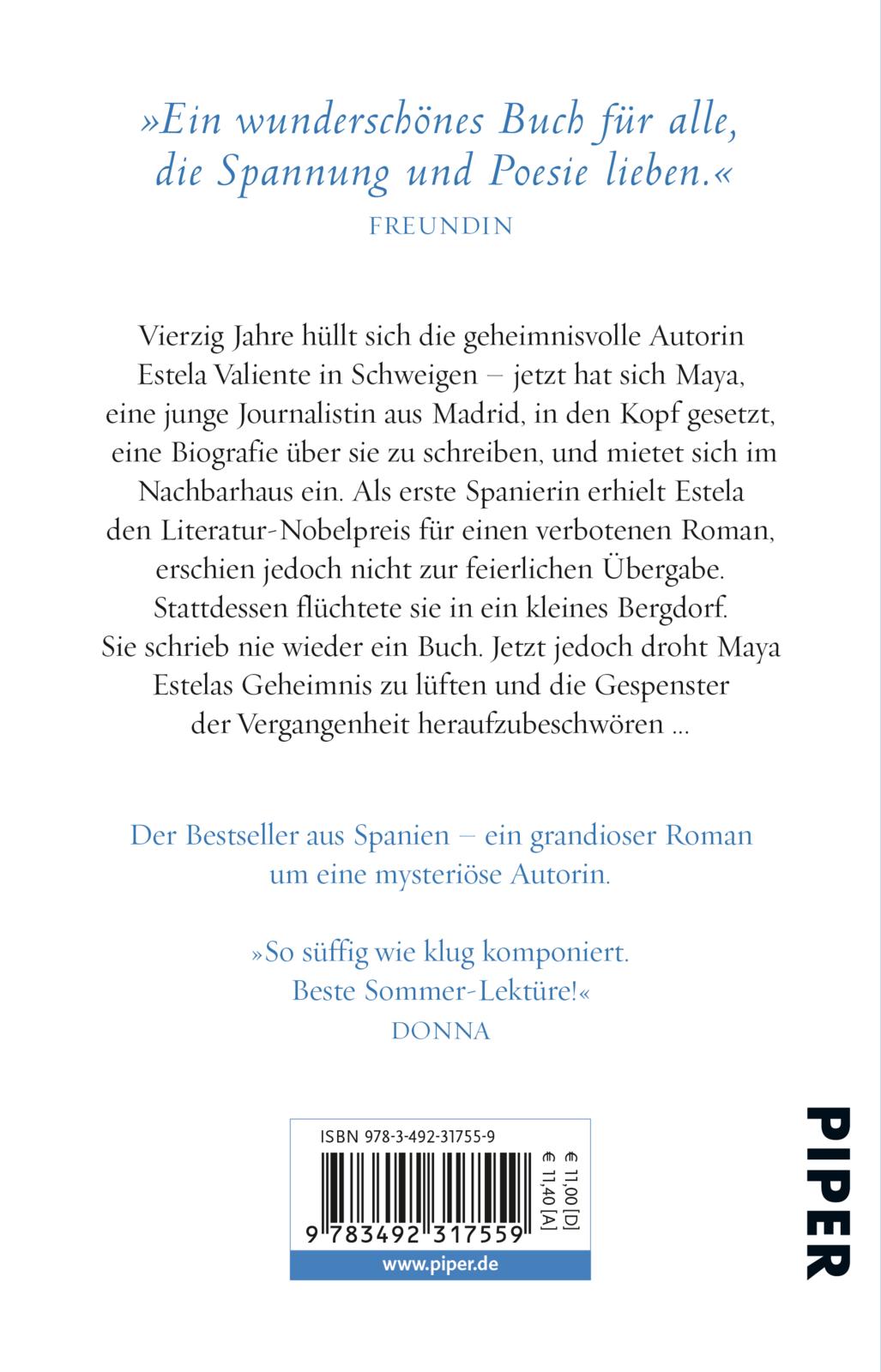 Vierzig Jahre hüllt sich die geheimnisvolle Autorin Estela Valiente in Schweigen – jetzt hat sich Maya, eine junge Journalistin aus Madrid, in den Kopf gesetzt, eine Biografie über sie zu schreiben, und mietet sich im Nachbarhaus ein. Estela erhielt als erste Spanierin den Literatur-Nobelpreis für einen verbotenen Roman, erschien jedoch nicht zu feierlichen Übergabe. Stattdessen flüchtete sie in das kleine Bergdorf. Jetzt jedoch droht Maya Estelas Geheimnis zu lüften und die Gespenster der Vergangenheit heraufzubeschwören ...