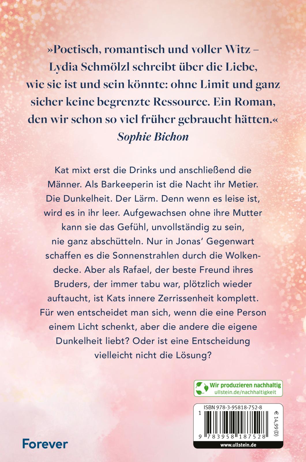 Kat mixt erst die Drinks und anschließend die Männer. Als Barkeeperin ist die Nacht ihr Metier. Die Dunkelheit. Der Lärm. Denn wenn es leise ist, wird es in ihr leer. Wenn es hell ist, fühlt sie sich noch dunkler. Aufgewachsen ohne ihre Mutter kann sie das Gefühl, unvollständig zu sein, nie ganz abschütteln. Nur in Jonas‘ Gegenwart schaffen es die Sonnenstrahlen durch die Wolkendecke. Aber als Rafael, der beste Freund ihres Bruders, der immer tabu war, plötzlich wieder auftaucht, ist Kats innere Zerrissenheit komplett. Für wen entscheidet man sich, wenn die eine Person einem Licht schenkt, aber die andere die eigene Dunkelheit liebt? Oder ist eine Entscheidung vielleicht nicht die Lösung?