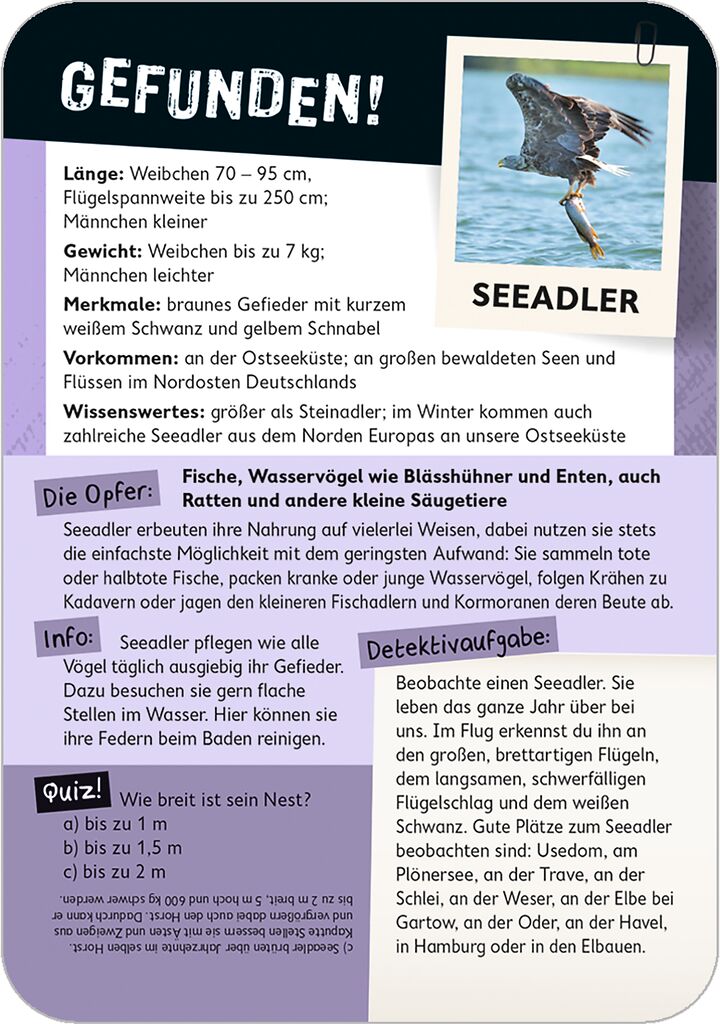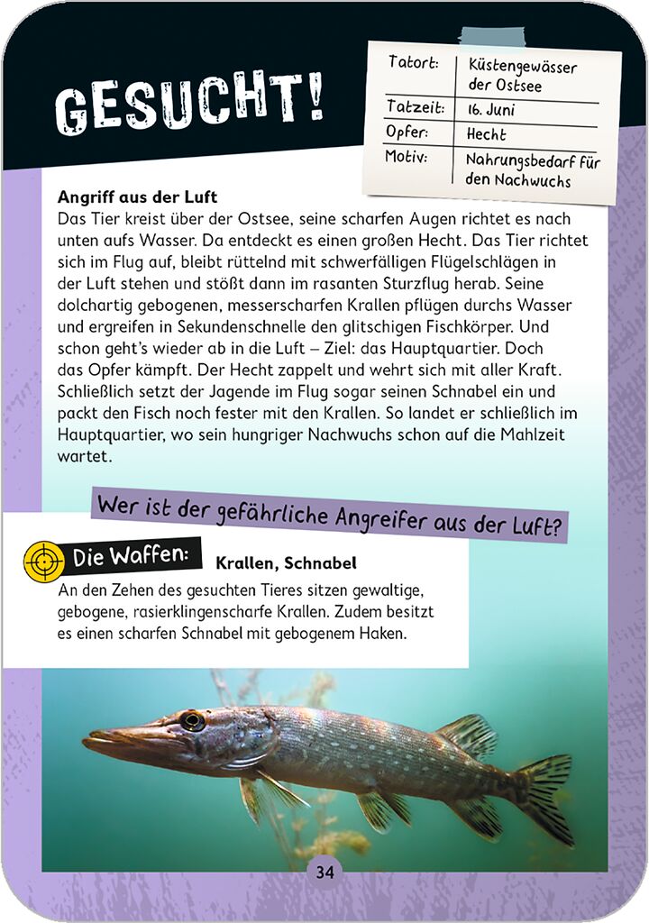 In diesem Kartenset trifft Natur auf Kriminalgeschichten. Jede der 50 Karten zeigt auf der Vorderseite eine Kriminalgeschichte. Hier wird ein Tathergang geschildert. Nun sind die detektivischen Fähigkeiten der Kinder gefragt. Anhand der Geschichte und weiteren Hinweisen können Kinder nun erraten, welches Tier gesucht ist. Die Rückseite verrät die Lösung und liefert zusätzlich spannende Informationen zu den beiden Tieren. Als Bonus warten Detektivaufgaben, Experimente und Quizfragen. Der beiliegende Leporello ordnet die Taten sachlich ein und erklärt, wieso aus menschlicher Sicht Tatorte in der Natur entstehen.
