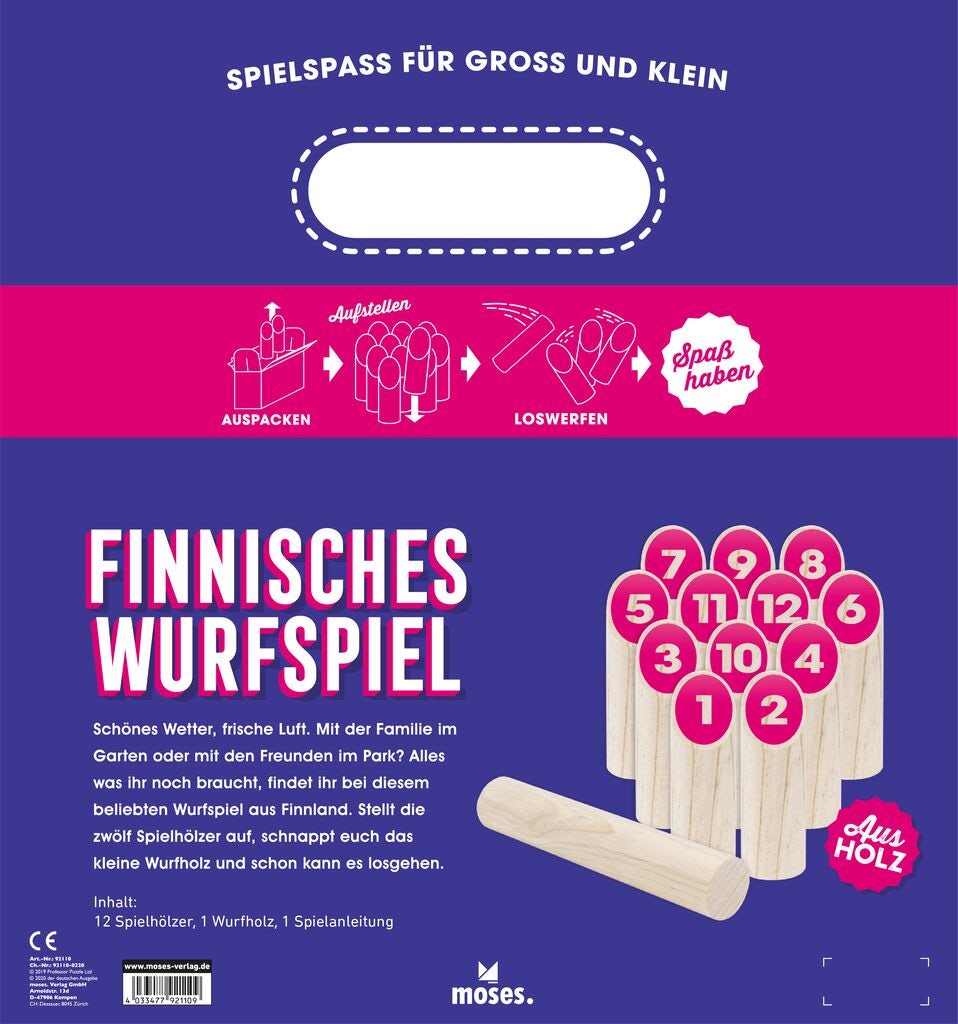 - Beschreibung Das beliebte Wurfspiel aus Finnland begeistert einfach alle! Das Geschicklichkeitsspiel wird im Freien gespielt und macht laue Sommerabende im Park oder im Garten zu einem unvergesslichen Erlebnis. Einmal losgespielt kann man so schnell nicht wieder aufhören, denn bei diesem ultimativen Spielspaß geht es Schlag auf Schlag. Und das Beste: Alle können mitspielen. Da es mehr um Geschick und Treffsicherheit und weniger um sportliche Leistung und Kraft geht, können sogar Kinder und Senioren ihr Glück versuchen. Je mehr Personen mitspielen, anfeuern und kluge Ratschläge geben, desto mehr Spaß macht das Holzspiel aus Finnland. Dank der schicken Transportbox kann es überallhin mitgenommen werden und ist perfekt für unterwegs. So wird’s gespielt: Einfach die 12 Spielhölzer aufstellen, eine Wurflinie festlegen und los geht’s. Nacheinander sind die Spieler an der Reihe und haben immer einen Versuch mit dem Wurfholz. Wirft man damit genau ein Spielholz um, erhält mandie aufgedruckte Zahl (1-12) als Punkte. Fällt mehr als ein Holz um, erhält man jedoch nur deren Anzahl. Wer auf genau 50 Punkte kommt, gewinnt. Wer über die 50 Punkte kommt, fällt auf 25 zurück. Inhalt 12 Spielhölzer 1 Wurfholz 1 Spielanleitung