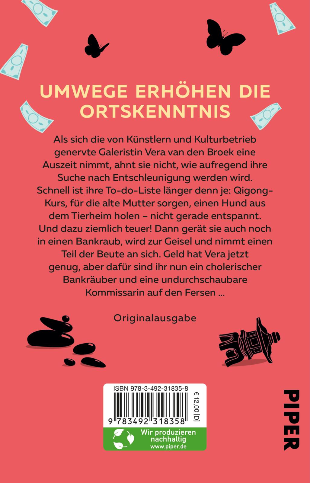 Als die von Künstlern und Kulturbetrieb genervte Galeristin Vera van den Broek eine Auszeit nimmt, ahnt sie nicht, wie turbulent ihre Suche nach Entschleunigung werden wird. Schnell ist ihre To-do-Liste länger denn je: Qigong, für die alte Mutter sorgen, Mal- und Sprachkurs, einen Hund aus dem Tierheim holen – nicht gerade entspannt. Und dazu ziemlich teuer! Dann gerät sie auch noch in einen Bankraub, wird zur Geisel und nimmt einen Teil der Beute an sich. Geld hat Vera jetzt genug, aber dafür sind ihr ein cholerischer Bankräuber und eine undurchschaubare Kommissarin auf den Fersen …