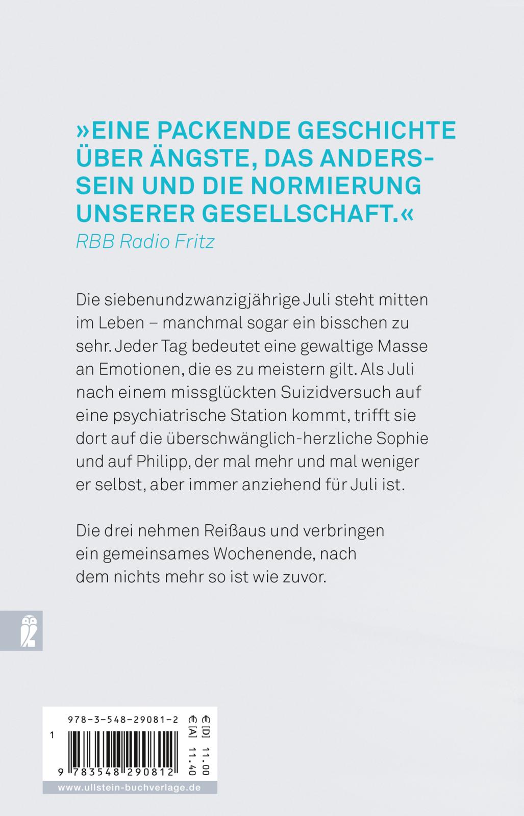 Die siebenundzwanzigjährige Juli steht mitten im Leben – manchmal sogar ein bisschen zu sehr. Sie ist Autistin und jeder Tag bedeutet eine gewaltige Masse an Emotionen, die es zu meistern gilt. Als Juli nach einem missglückten Suizidversuch auf eine psychiatrische Station kommt, trifft sie dort auf die überschwänglich-herzliche Sophie und auf Philipp, der mal mehr und mal weniger er selbst, aber stets anziehend für Juli ist. Die drei nehmen Reißaus und verbringen ein gemeinsames Wochenende, nachdem nichts mehr so ist wie zuvor.