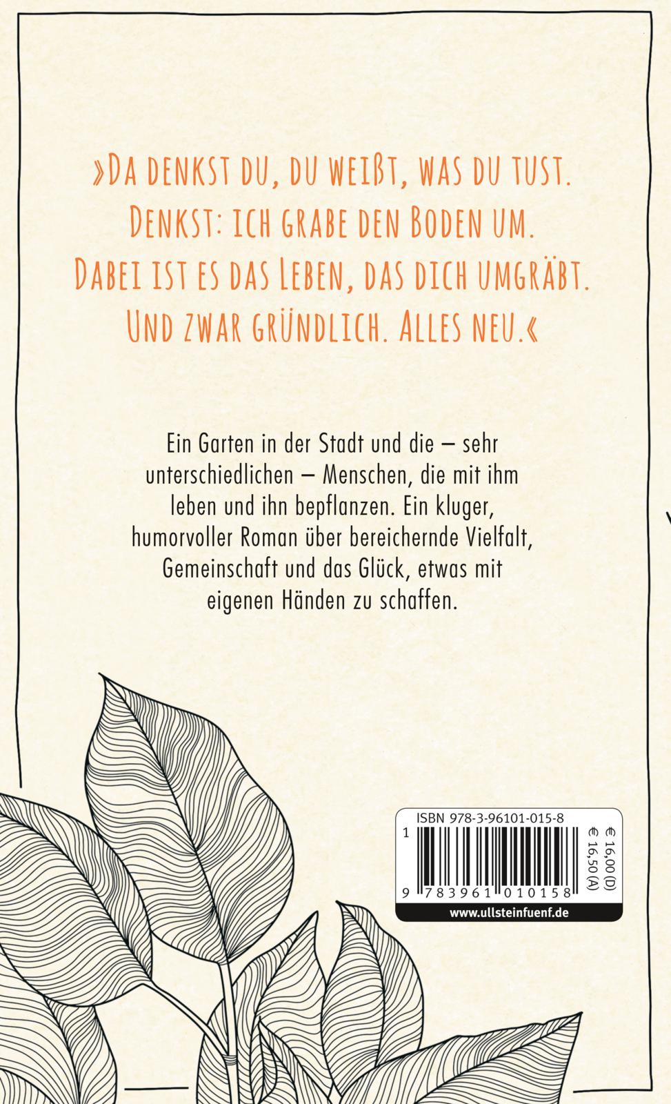 Doro und ihr Freund Rob haben, wovon andere träumen: ein Stück Natur mitten in der Großstadt. Dass die beiden Mittdreißiger im Hinterhof ihres Mietshauses Zucchini ernten können, verdanken sie Fred, Texaner, Ex-GI, leidenschaftlicher Hobbygärtner. Alle Hausbewohner sind Teil seines Projekts. Es wird geliebt und gestritten in der Drübkestraße 13, jemand stirbt und ein neuer Mieter zieht ein, es gibt einen Ehekrach und einen kuriosen Fund zwischen den Rosen, und auch Cousine Pippa aus Berlin kommt zu Besuch und erklärt, warum der Stadtgarten kein »Urban Garden« ist (zu ordentlich und »nicht vertikal genug«).