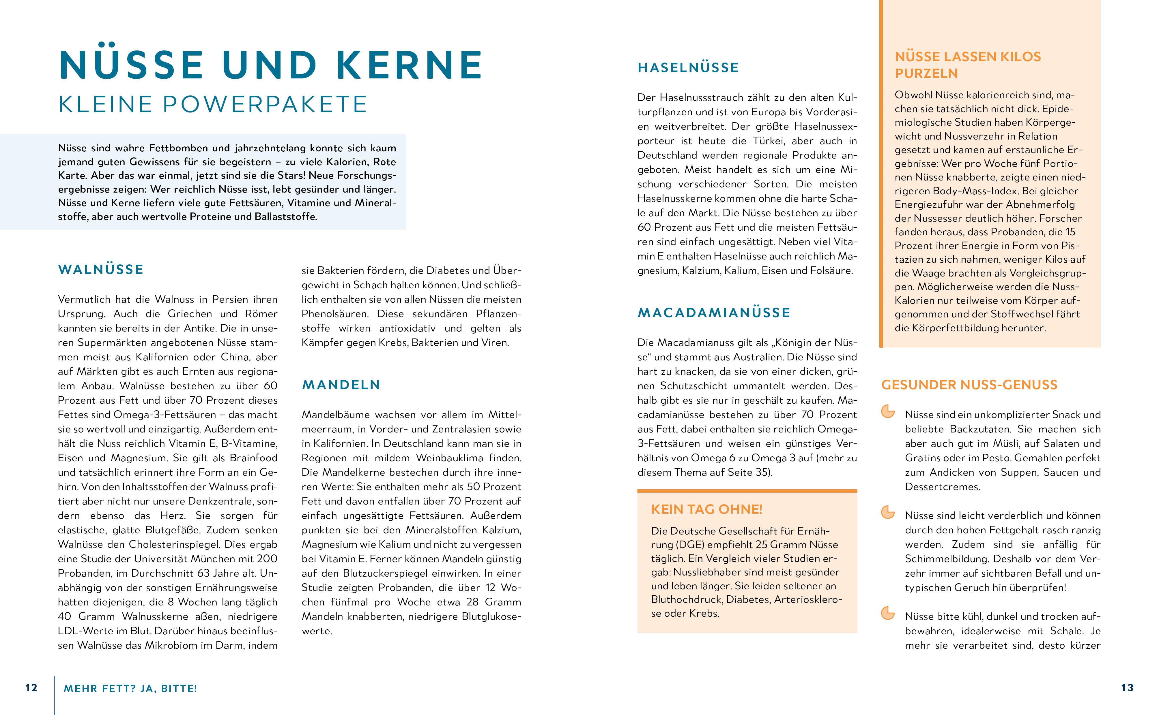 In diesem Ratgeber werden wichtige Fettlieferanten wie Nüsse, Öle, Hanfsamen, Avocado oder Lachs sowie deren Wirkmechanismen im Körper detailliert und verständlich dargestellt. Ernährungsmedizinerin Dr. med. Claudia Thiel bereinigt gängige Fett-Mythen im Interview und klärt über Fett-Fakten auf. Dazu finden sich spannende Fakten zum „Low Carb High Fat (LCHF)“ Prinzip, dem Abnehmen mit Fetten und Einflüssen auf den Fettstoffwechsel. Für ein Geschmackserlebnis sorgen die enthaltenen 50 fettreichen Rezepte: Chia-Pudding mit Früchten, Salate verschiedener Art mit Huhn, Rauchmandeln oder Knusperlachs oder Bulletproof Coffee.