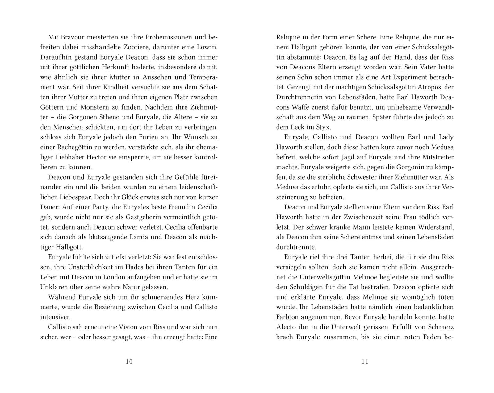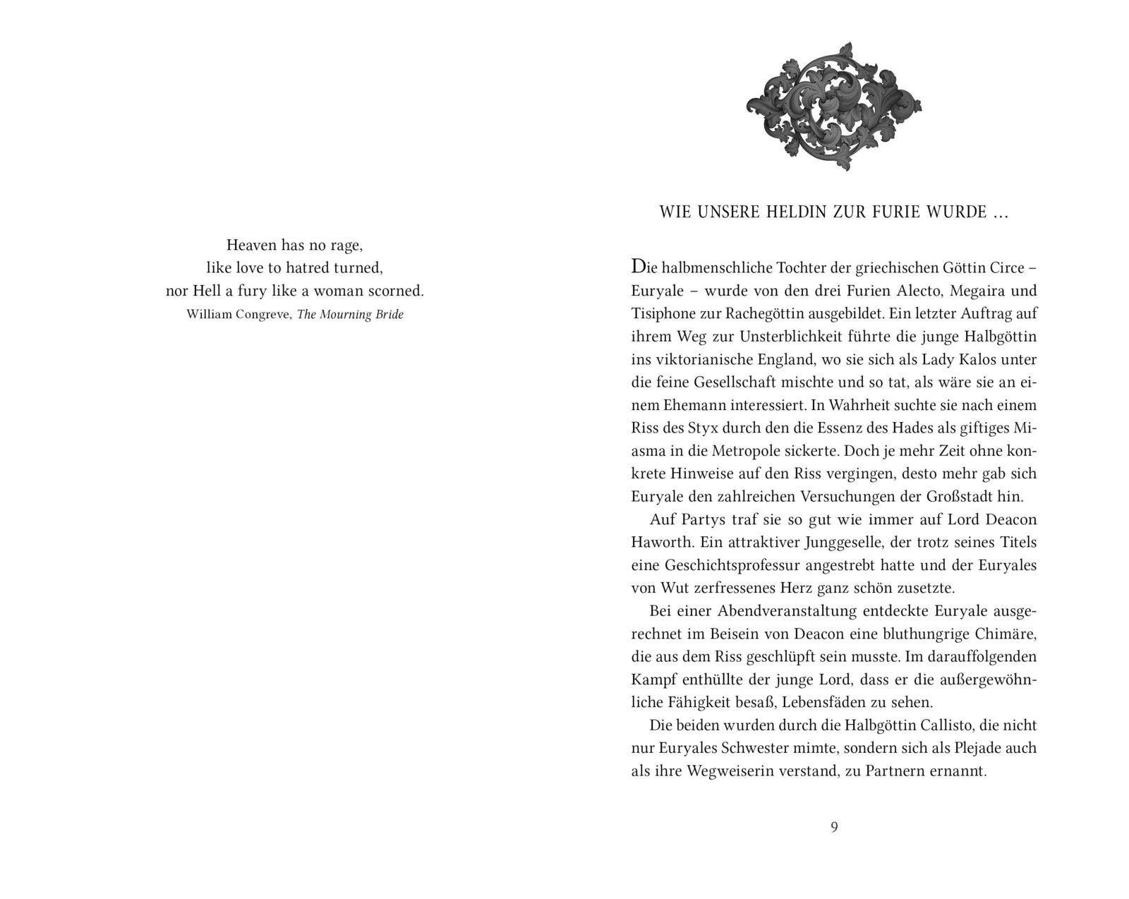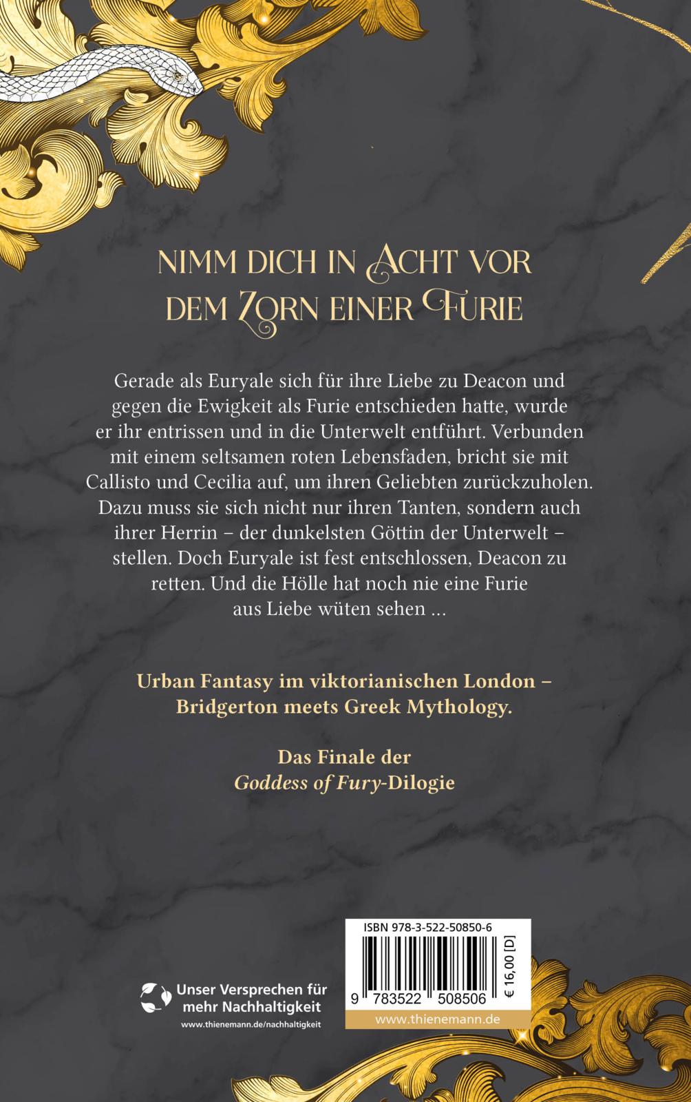 Gerade als Euryale sich für ihre Liebe zu Deacon und gegen die Ewigkeit als Furie entschieden hatte, wurde er ihr entrissen und in die Unterwelt entführt. Verbunden mit einem seltsamen roten Lebensfaden, bricht sie mit Callisto und Cecilia auf, um ihren Geliebten zurückzuholen. Dazu muss sie sich nicht nur ihren Tanten, sondern auch ihrer Herrin – der dunkelsten Göttin der Unterwelt – stellen. Doch Euryale ist fest entschlossen, Deacon zu retten. Und die Hölle hat noch nie eine Furie aus Liebe wüten sehen …