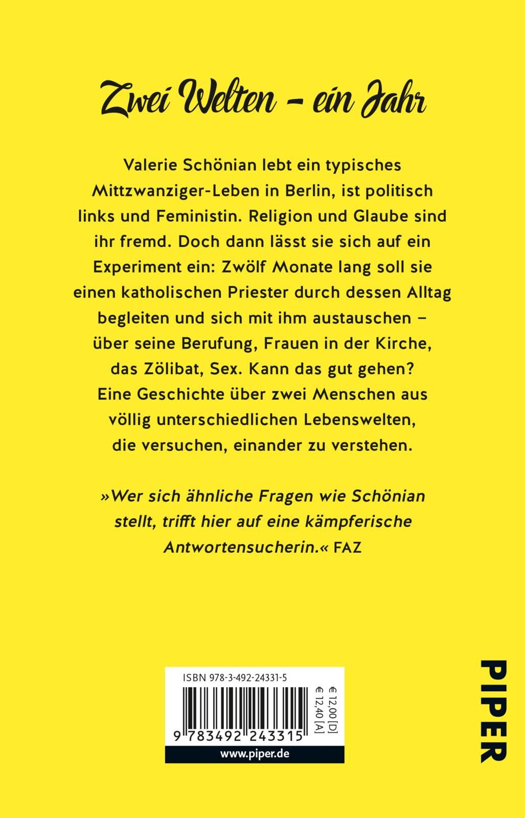 Valerie Schönian lebt ein typisches Mittzwanziger-Leben in Berlin, ist politisch links und Feministin. Religion und Glaube sind ihr fremd. Doch dann lässt sie sich auf ein Experiment ein: Zwölf Monate lang soll sie den katholischen Priester Franziskus von Boeselager durch dessen Alltag begleiten und sich mit ihm austauschen - über seine Berufung, Frauen in der Kirche, das Zölibat, Sex. Kann das gut gehen? Eine Geschichte über zwei Menschen aus völlig unterschiedlichen Lebenswelten, die versuchen, einander zu verstehen.